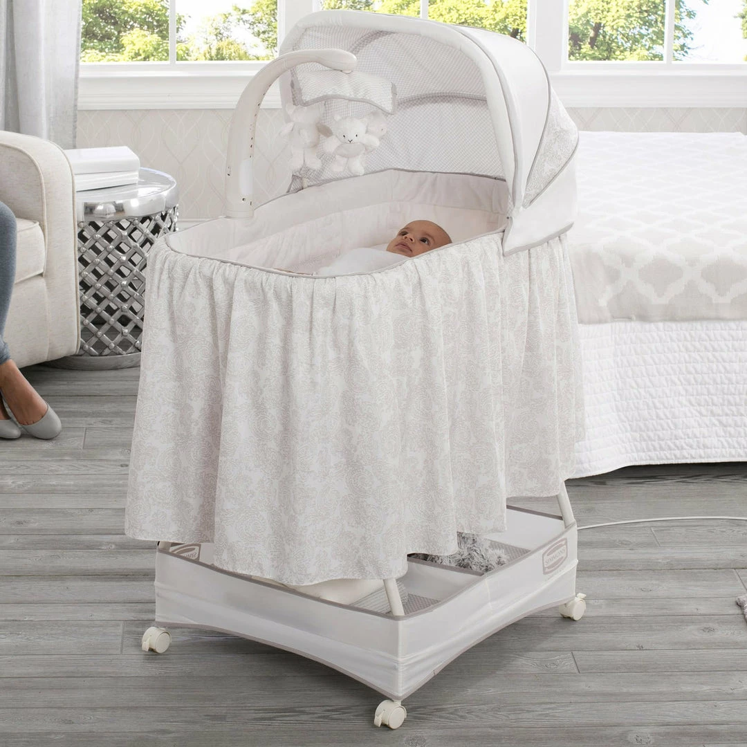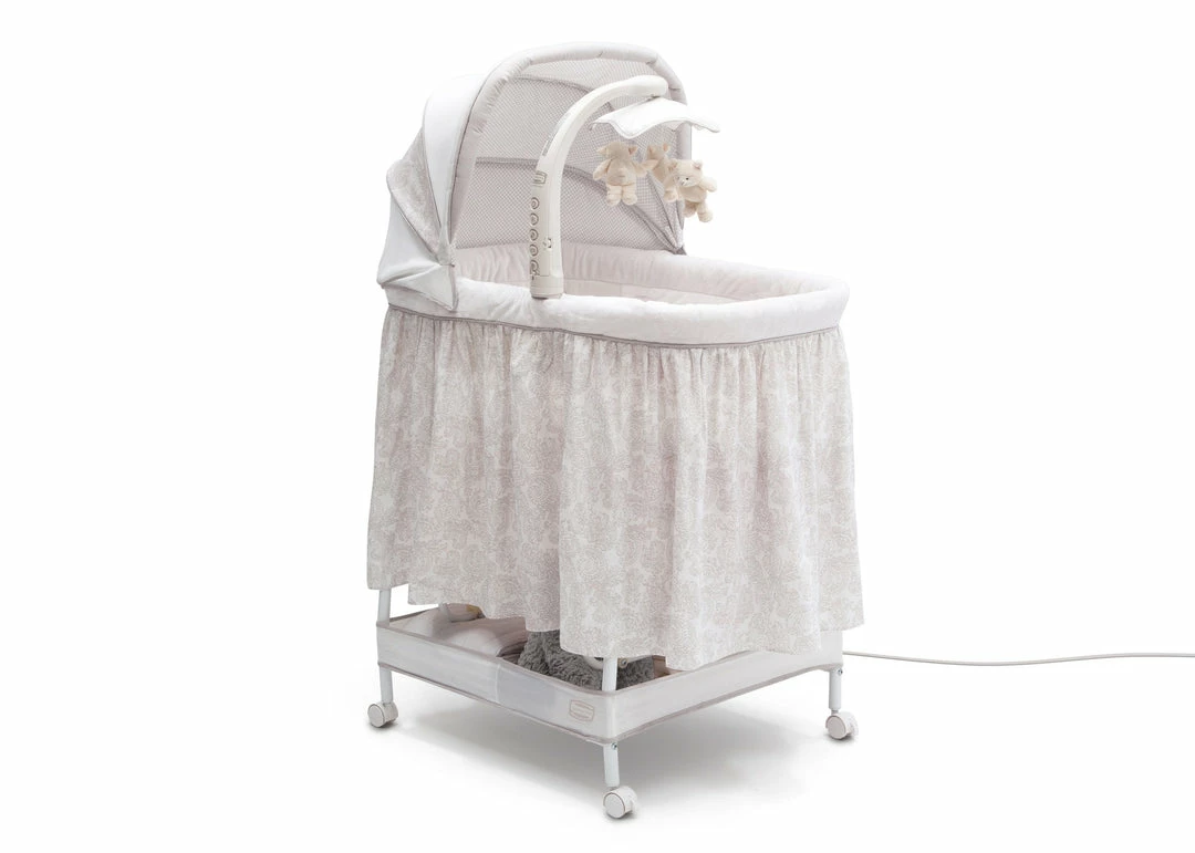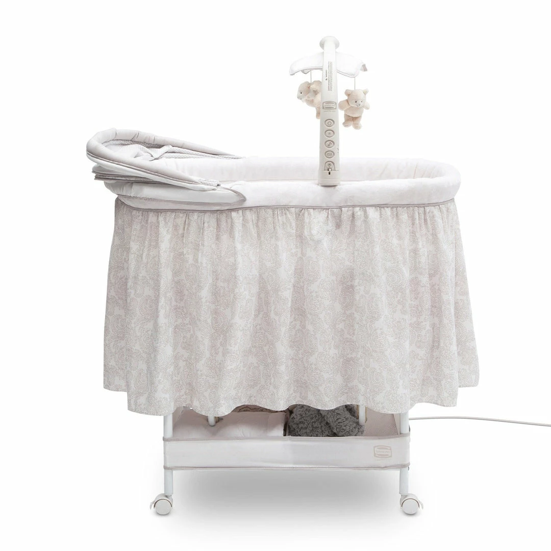 Lull your baby to sleep with the relaxing, automatic gliding movement of the Silent Auto Gliding Deluxe Bassinet from Simmons Kids®. With a push of a button, the bassinet’s whisper-quiet gliding motion is activated, and the smooth sway of the bassinet will help your newborn drift to sleep peacefully. Outfitted with other electronic features that’ll help Baby power down, this bassinet comes outfitted with an Activity Mobile Arm that plays soothing music and features twinkle lights, a nightlight and rotating plush toys—it has everything you need to effortlessly tackle bedtime with your newborn. Built with locking wheels and a lightweight frame to make it easy to move from room to room, this bassinet ensures your little one will have a safe spot to rest in any room of the house—it’s ideal for bedtime or daytime naps, since the adjustable canopy allows you to block light in order to create a serene sleep space anywhere and anytime.