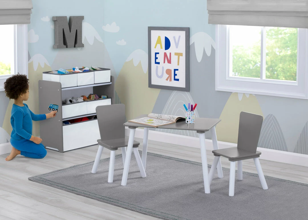 Complete your child’s playroom or bedroom with this 4-Piece Toddler Playroom Set by Delta Children. Vibrant and playful, this set includes a wooden play table with dry erase tabletop, two coordinating chairs and a toy organizer. Also included in this set, a set of reusable vinyl cling stickers that kids will love arranging to the sides of the toy organizer to create a new story every time they play. All items are at the perfect kid-sized height to help teach your little one responsibility and independence as they play, eat and clean up on their own. The adorable two-tone design ensures your little one’s playroom is a stylish and charming as the rest of your home. Ideal for both boys and girls, this kids’ playroom set comes in two colors, Grey/White and Pink/White. Get it today–the play possibilities are endless with this versatile set! Recommended for ages 3+.