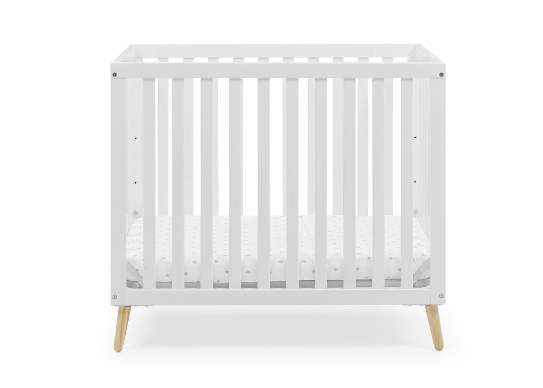 The Essex Convertible Mini Baby Crib with 2.75-Inch Mattress by Delta Children is full of modern style, safety features and craftsmanship, just in a scaled-down size. Designed for urban spaces, smaller nurseries or as a spare crib for grandma and grandpa’s house, this versatile mini crib features angled feet in a natural finish, two adjustable mattress positions that allow you to lower the mattress height as baby grows, plus it includes a comfy, water-resistant crib mattress. Extending its value well past the nursery, the Essex Convertible Mini Baby Crib by Delta Children converts into a twin bed with or without a footboard when the time is right (conversion rail sold separately).