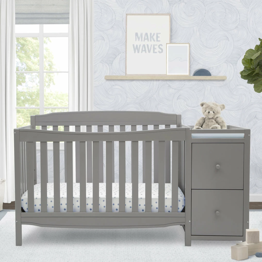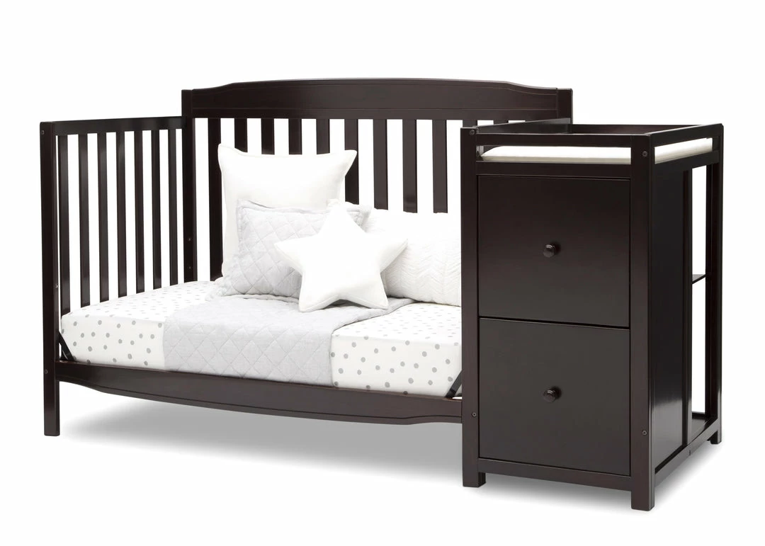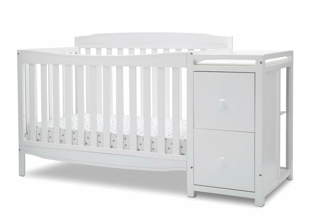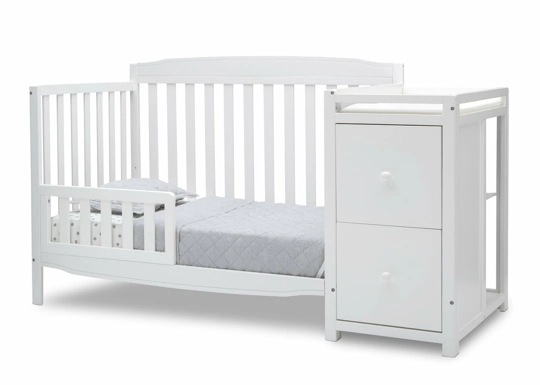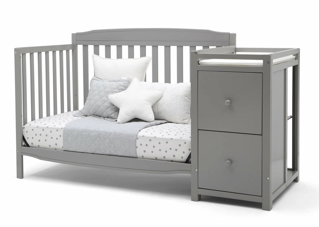 The Mason Convertible 6-in-1 Crib and Changer from Delta Children combines style and storage to create the perfect space-saving baby crib and changing table combo. A versatile option for those who need multi-functional nursery furniture, the Mason provides all the elements needed to create the ultimate nursery without taking up a lot of floor space. Built to accommodate every stage of your child’s life, this crib features three mattress height positions that can be easily lowered as your baby begins to sit or stand. Plus, this crib converts into a toddler bed, daybed, sofa, full size bed with headboard only and full size bed with headboard and footboard. The secure changing table section includes a changing pad on top, then underneath two drawers and open cubby space help keep your baby’s essentials close at hand. Everything you need to furnish your nursery, the Mason 6-in-1 Convertible Crib and Changer from Delta Children is a convertible crib, changing table and storage piece all in one (Daybed/Sofa Rail included; Toddler Guardrail and Full Size Bed Rails sold separately). Available in Grey, Bianca White and Dark Chocolate.