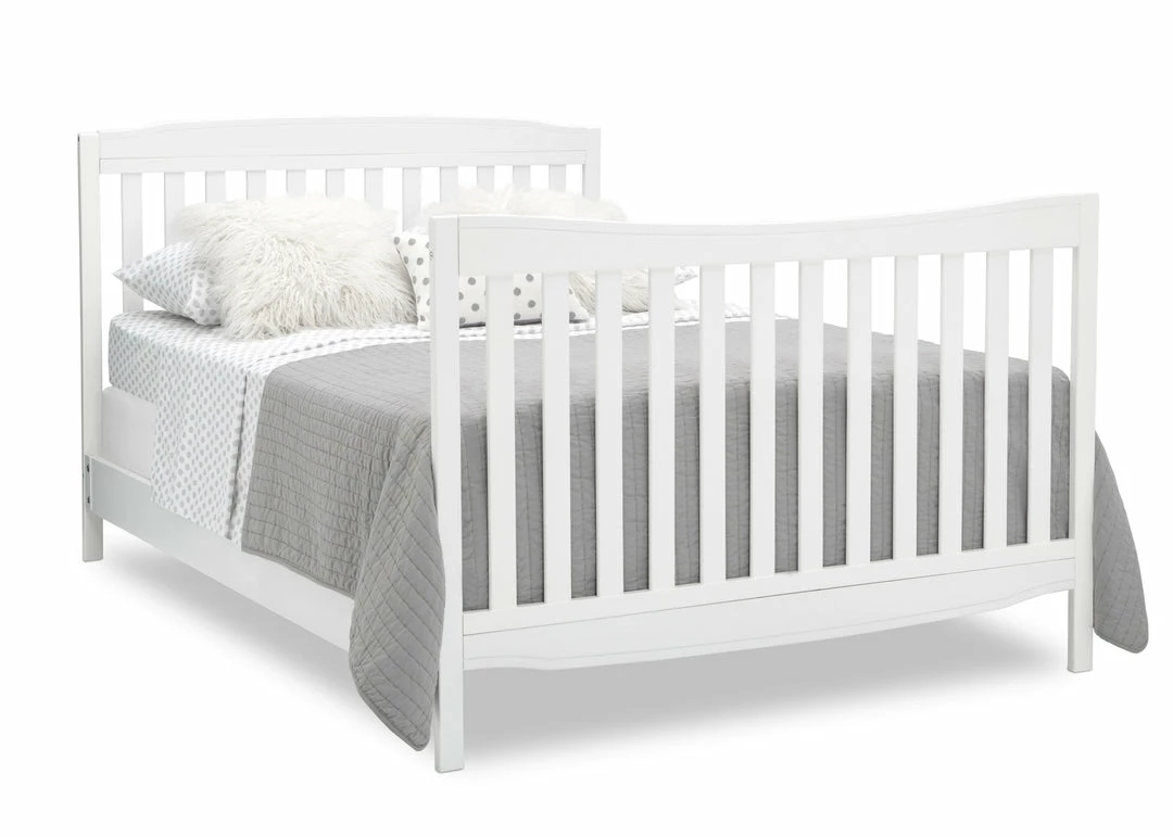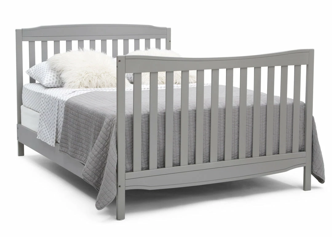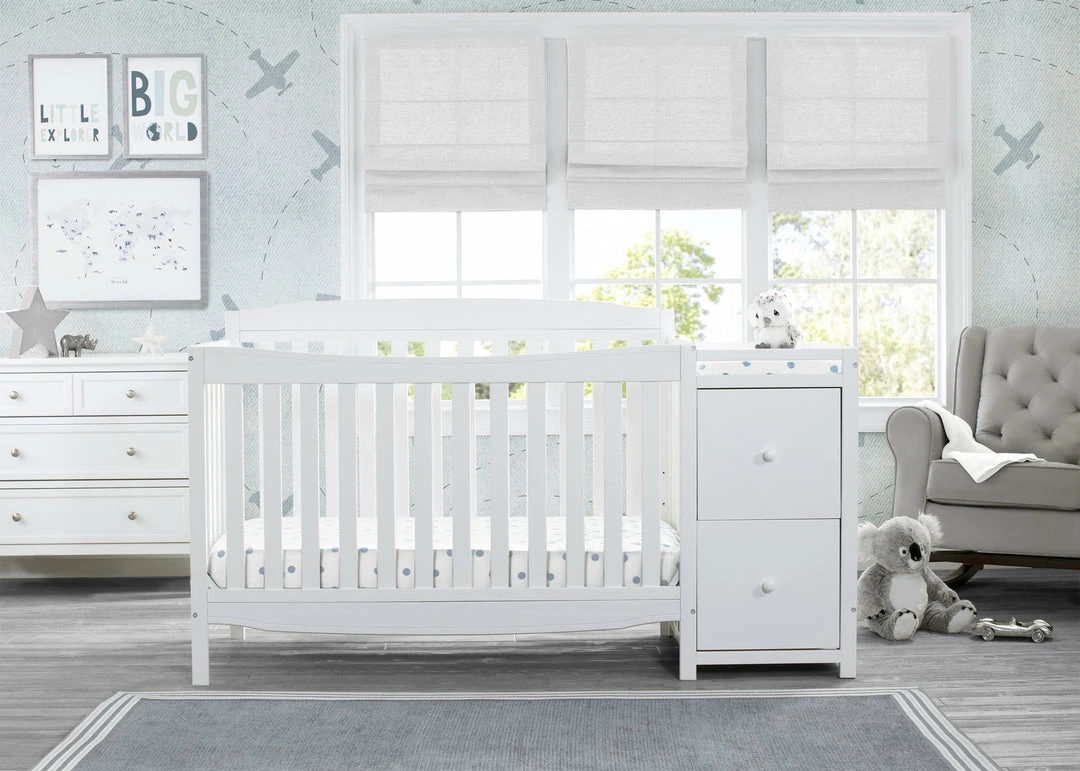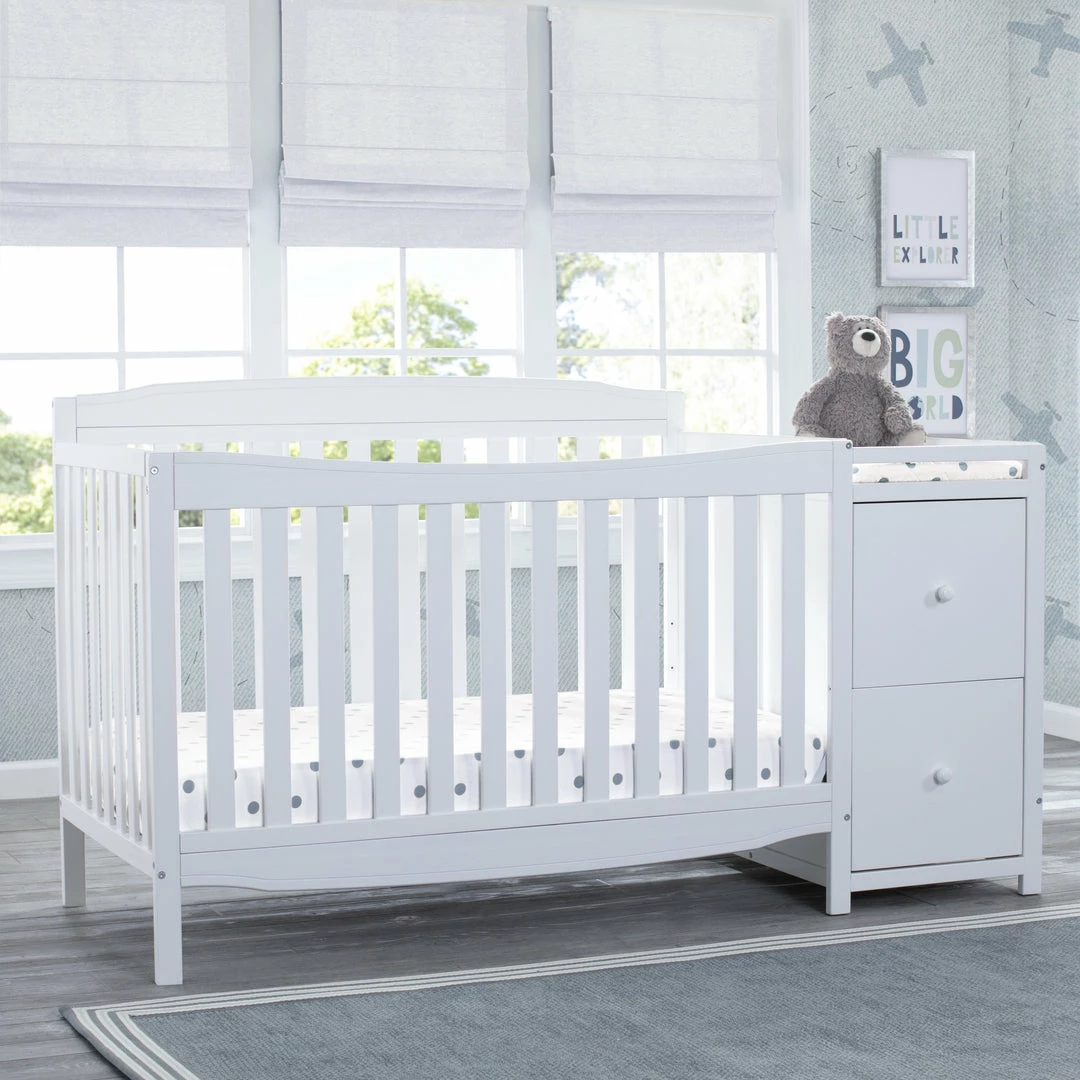 The Mason Convertible 6-in-1 Crib and Changer from Delta Children combines style and storage to create the perfect space-saving baby crib and changing table combo. A versatile option for those who need multi-functional nursery furniture, the Mason provides all the elements needed to create the ultimate nursery without taking up a lot of floor space. Built to accommodate every stage of your child’s life, this crib features three mattress height positions that can be easily lowered as your baby begins to sit or stand. Plus, this crib converts into a toddler bed, daybed, sofa, full size bed with headboard only and full size bed with headboard and footboard. The secure changing table section includes a changing pad on top, then underneath two drawers and open cubby space help keep your baby’s essentials close at hand. Everything you need to furnish your nursery, the Mason 6-in-1 Convertible Crib and Changer from Delta Children is a convertible crib, changing table and storage piece all in one (Daybed/Sofa Rail included; Toddler Guardrail and Full Size Bed Rails sold separately). Available in Grey, Bianca White and Dark Chocolate.