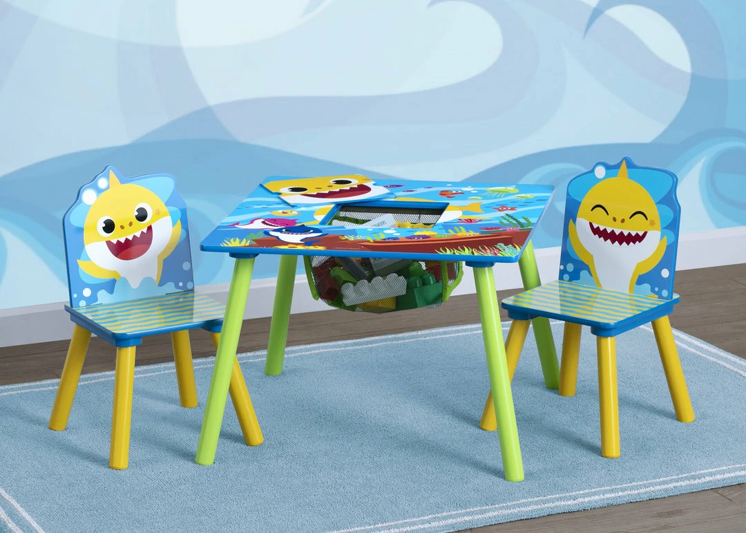 You’ve heard the Baby Shark song… now you can bring the Baby Shark family into your home this Baby Shark Kids Table and Chair Set with Storage by Delta Children. Featuring character graphics of Baby Shark, Mommy Shark, Daddy Shark, Grandma Shark and Grandpa Shark, this table and chair set is totally jaw dropping. Making any activity extra-special, this kids table and chair set features a table and two chairs, designed at the perfect kid-sized height, making it ideal for snack time, playtime or homework. Plus, a built-in storage compartment at the center of the table provides the perfect space to keep art supplies.