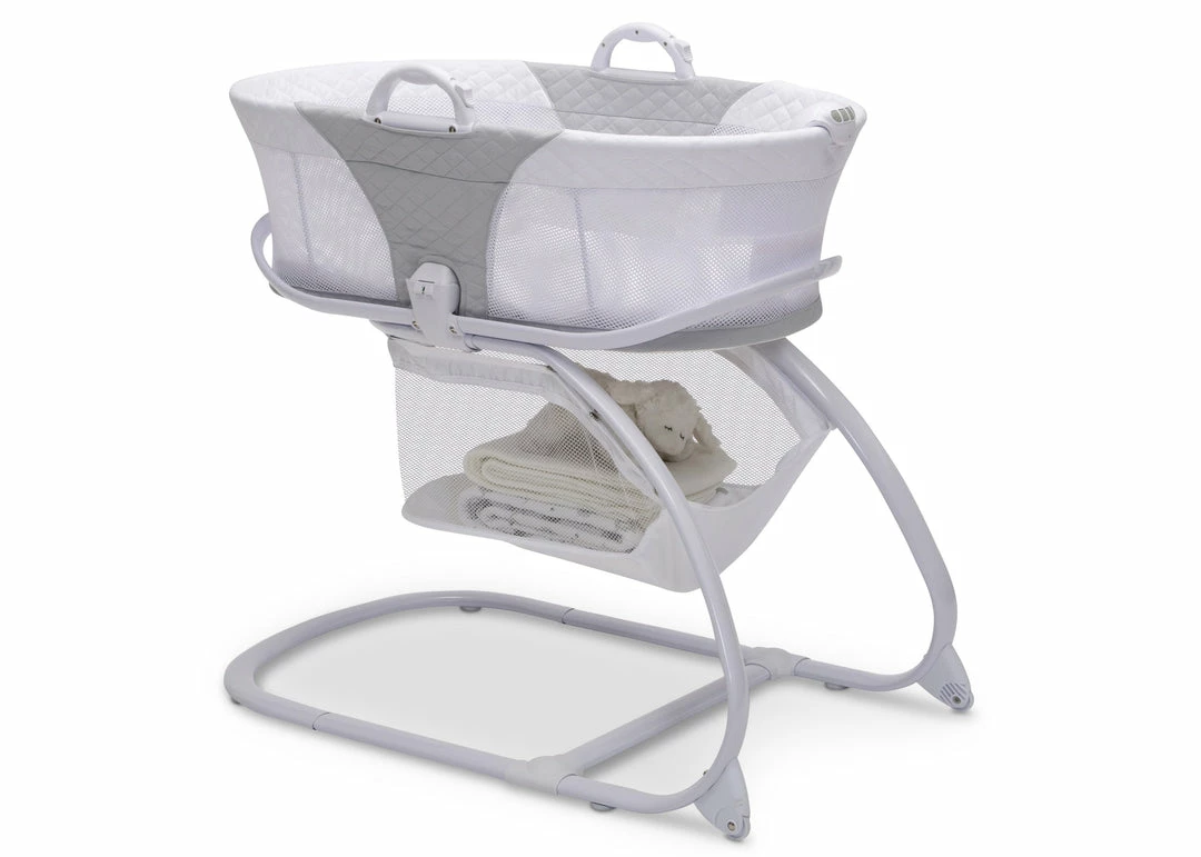 The 2-in-1 Moses Basket Bedside Bassinet Sleeper by Delta Children is a comfortable sleep space for newborns that combines a Moses basket with a standard bassinet. The adorable Moses basket safely attaches to the bassinet frame, and can be easily removed, so you can keep your baby nearby as you move around the house. To calm your newborn, the attached electronic pod plays peaceful music or sounds, emits gentle vibrations and features a soft-glow nightlight. An easy-to-reach storage basket keeps blankets, diapers or other supplies nearby. A great first sleep space for your baby, the 2-in-1 Moses Basket Bedside Bassinet Sleeper by Delta Children is a versatile option that works in your bedroom, the living room, the kitchen, or anywhere else in the house you may go. This bassinet is recommended for babies 0-5 months. Max weight 30 lbs. Stop use at 5 months or once your infant begins to push up on their hands and knees, whichever comes first.