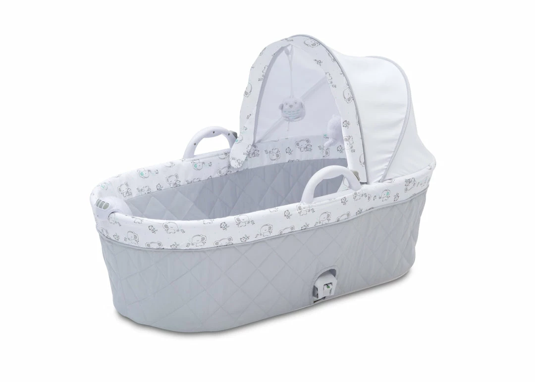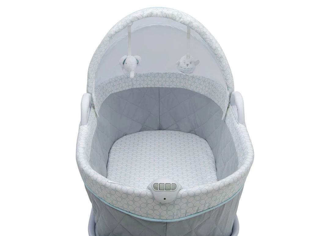 The Deluxe Moses Bassinet from Delta Children is a comfortable sleep space for newborns that combines a Moses basket with a standard bassinet. The adorable Moses basket safely attaches to the bassinet frame, and can be easily removed, so you can keep your baby nearby as you move around the house. To calm your newborn, the attached electronic pod plays peaceful music or emits gentle vibrations while two plush hanging toys attached to the canopy will stimulate Baby’s visual senses if they wake. A soft nightlight will help you check in on your little one without disturbing them, and an easy-to-reach storage basket keeps blankets, diapers or other supplies nearby. The bassinet’s adjustable canopy offers light blocking protection for daytime naps. A great first sleep space for your baby, the Deluxe Moses Bassinet from Delta Children is a versatile option that works in your bedroom, the living room, the kitchen, or anywhere else in the house you may go.