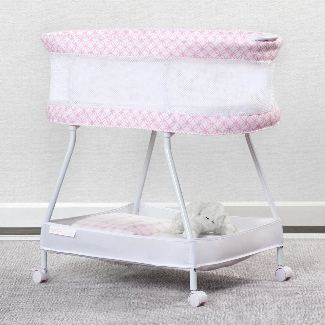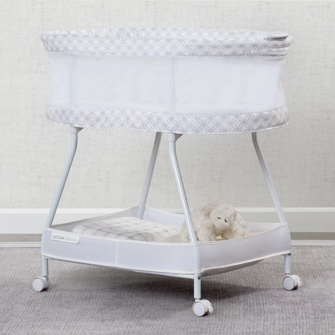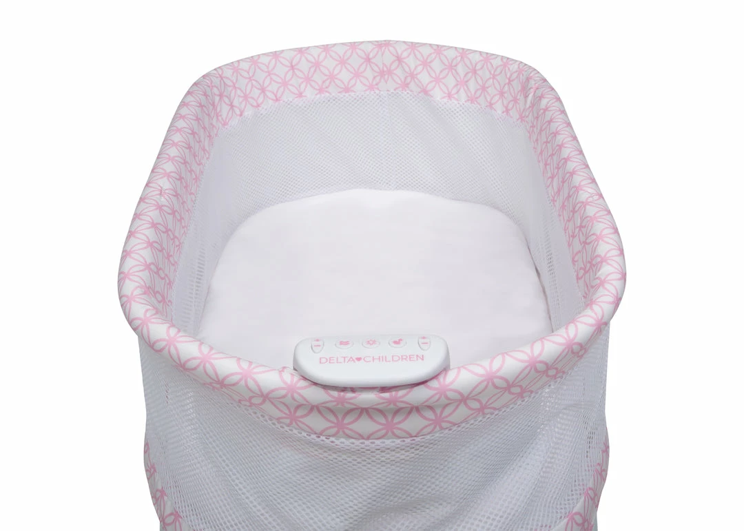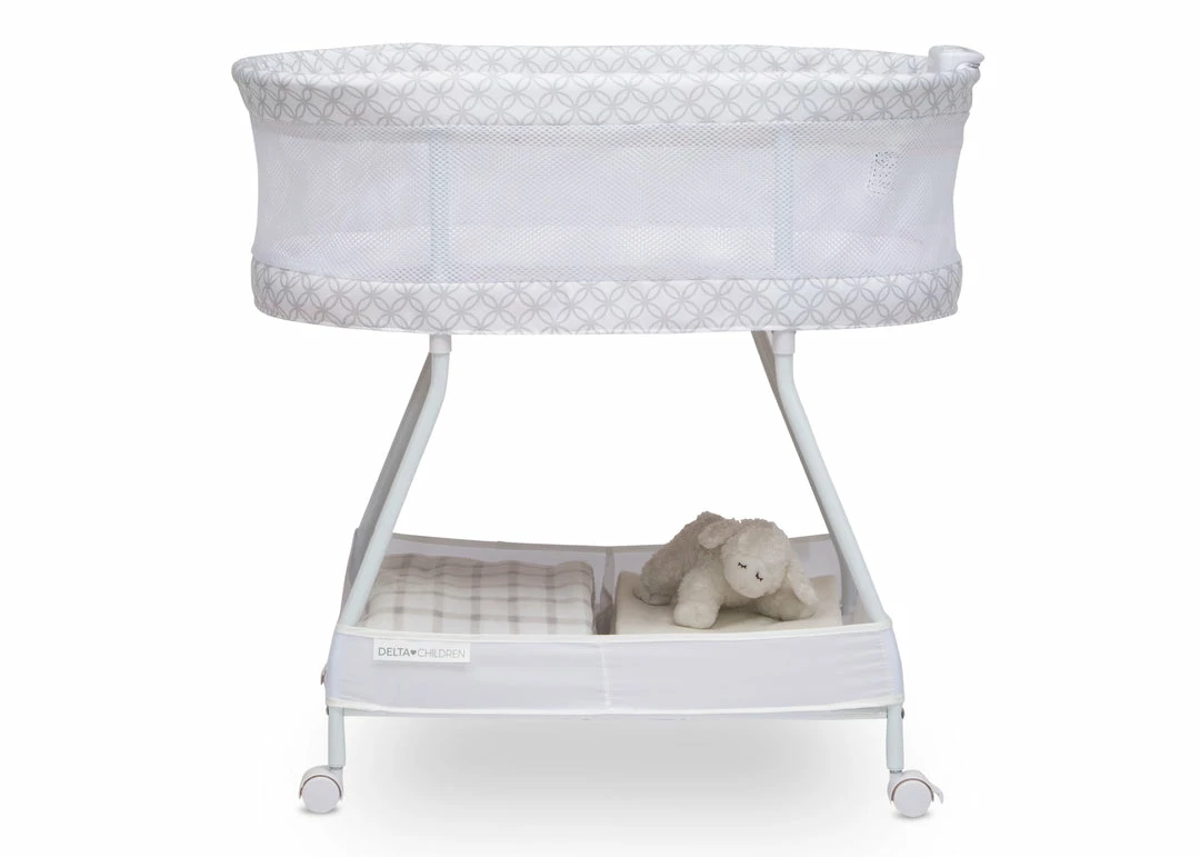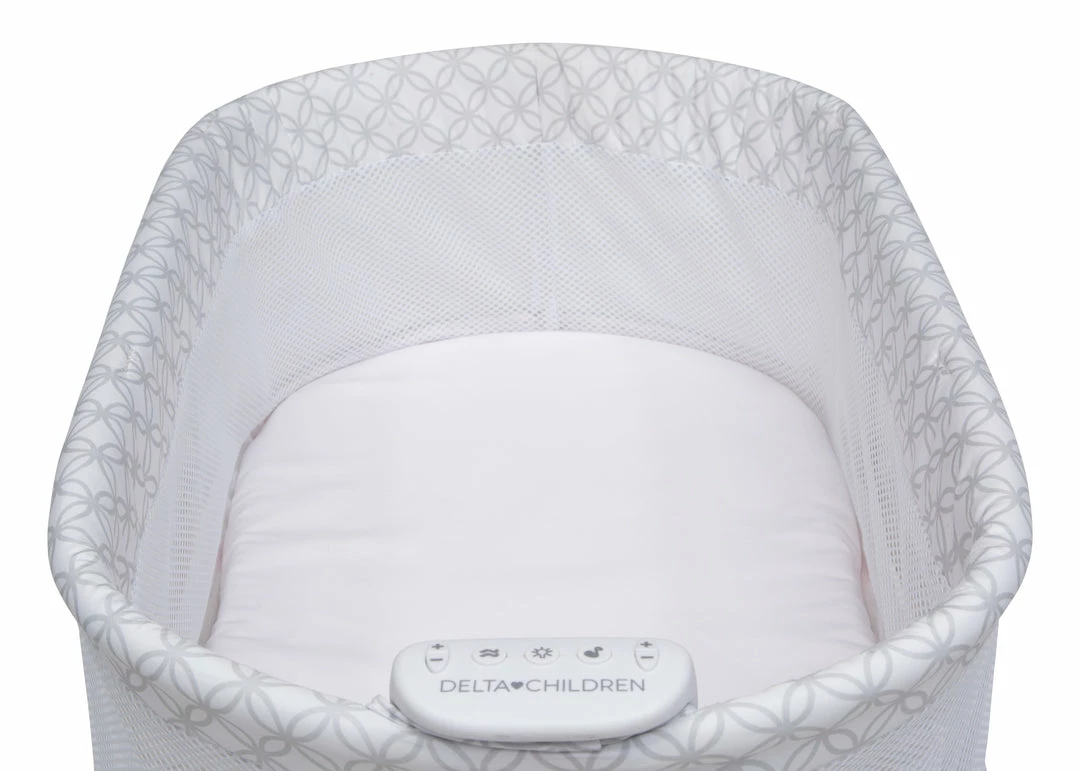 Keep your newborn safely nearby with the Sweet Dreams Bassinet by Delta Children. Designed to help baby and parents sleep better, it features breathable mesh sides for air flow and visibility, as well as an electronic pod that has vibration, music, nature sounds and nightlight. A dream come true for new parents, this bedside sleeper includes a machine washable bassinet sheet, large storage basket that keeps essentials close and wheels that make it easy to move. The modern pattern ensures this bassinet flawlessly coordinates with any décor. This bassinet is recommended for babies 0-5 months. Max weight 30 lbs. Stop use at 5 months or once your infant begins to push up on their hands and knees, whichever comes first.