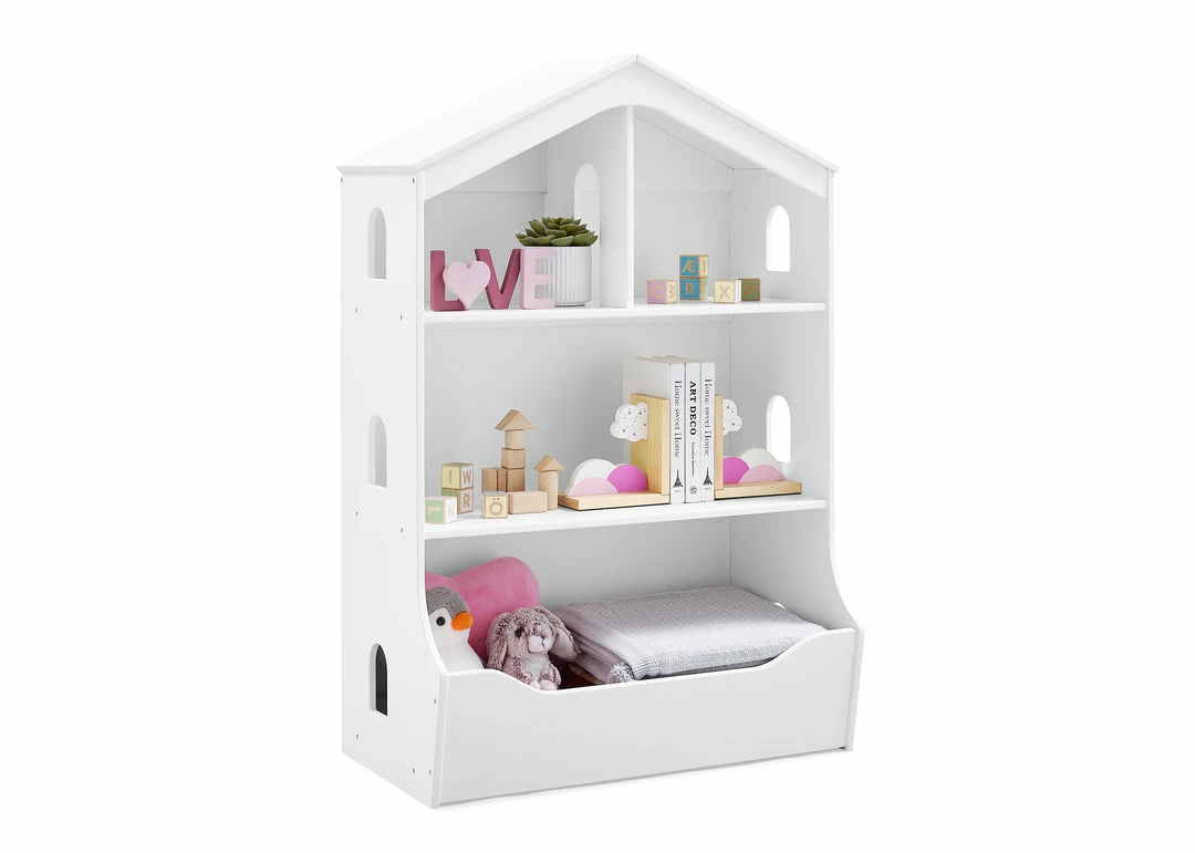 Keep your little one’s bedroom or playroom organized with the Playhouse Bookcase with Toy Storage by Delta Children. This adorable bookcase houses two shelves and a roomy toy bin on the bottom that makes it great not just for books, but for toys, too. Cutout windows and a cool passthrough on the top shelf of this bookcase inspires imaginative play and doubles as modern space for your child’s dolls. Available in Grey, Bianca White and Mint.