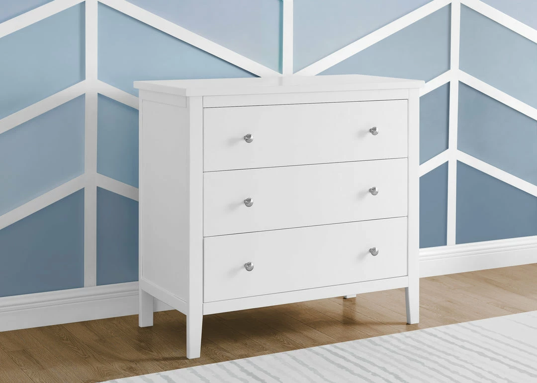 Bring your dream nursery to life with the Campbell 3 Drawer Dresser by Delta Children. Clean lines, playful round knobs and tapered legs define this beautiful dresser. This dresser also has a smooth metal glide system with safety stops that prevent drawers from pulling out, so it is easy and safe for kids to manage on their own. Pair this dresser with other pieces in the Campbell Nursery Collection for a coordinated look, as well as the coordinating Changing Top #W100810 (sold separately) to transform this dresser into a convenient changing table.