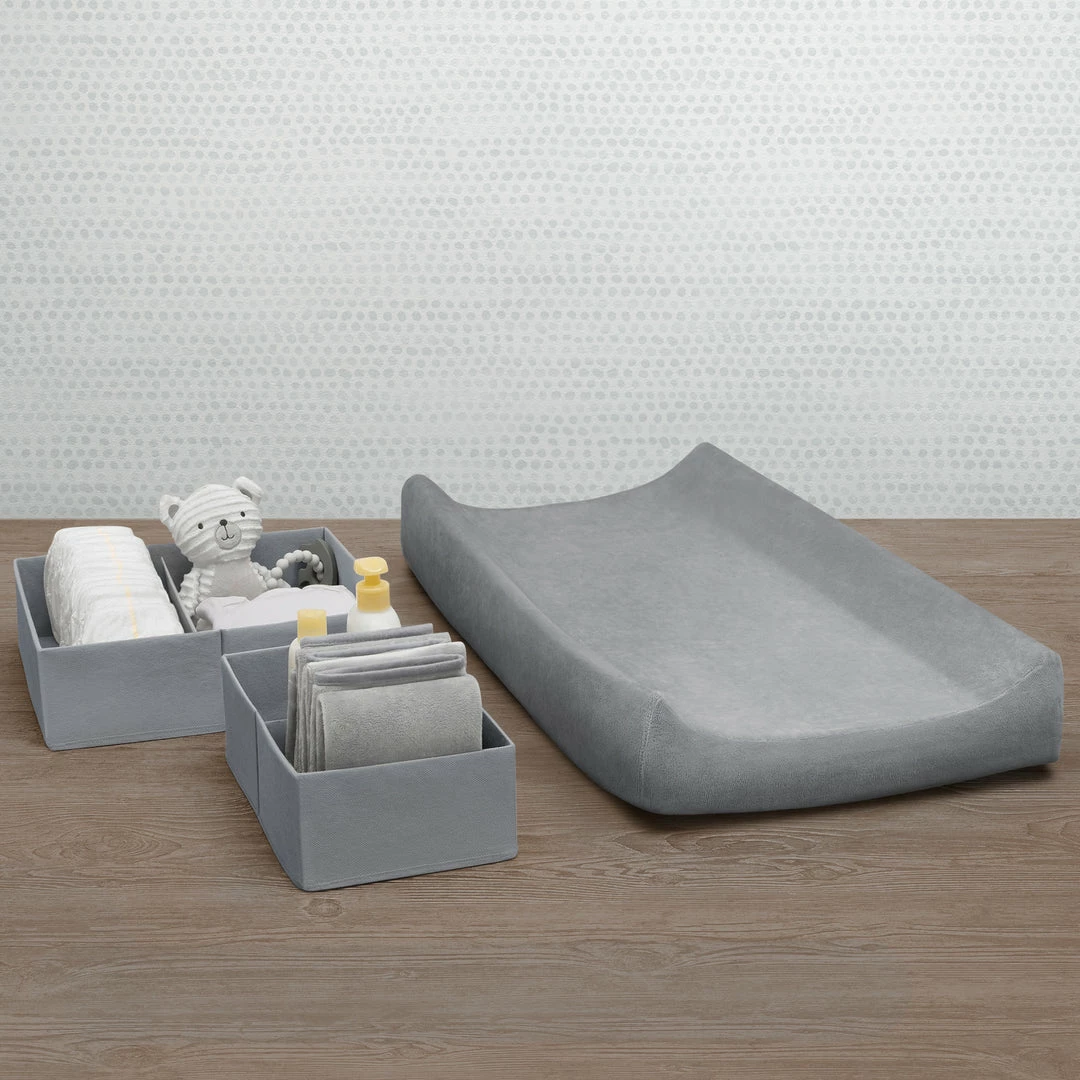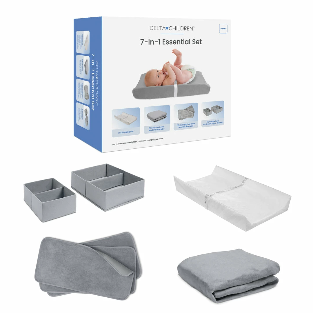 Create a cozy and organized place for your baby during diaper changes with this 7-Piece Essential Changing Table Set by Delta Children. This convenient set includes all the necessary items—a Changing Pad, Plush Changing Pad Cover, 3 Changing Pad Liners and 2 Storage Bins. The Changing Pad features a secure safety harness with a quick release buckle and a waterproof and hypoallergenic design that easily wipes clean. The Changing Pad Cover is machine washable and provides a plush, comfortable changing environment for your baby. Use the three Changing Pad Liners on top of the changing pad for an additional waterproof layer or use them as a portable changing pad for a soft changing surface while on the go. The included storage bins provide organization, allowing you to keep changing necessities within reach. Packaged in an easily giftable box, this 7-Piece Essential Changing Table Set is the ideal gift for baby showers or new parents.