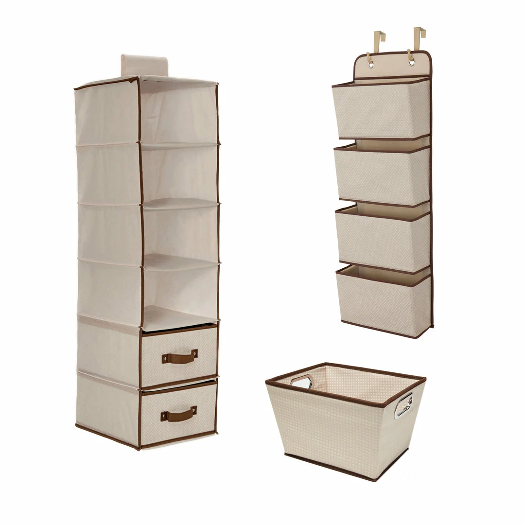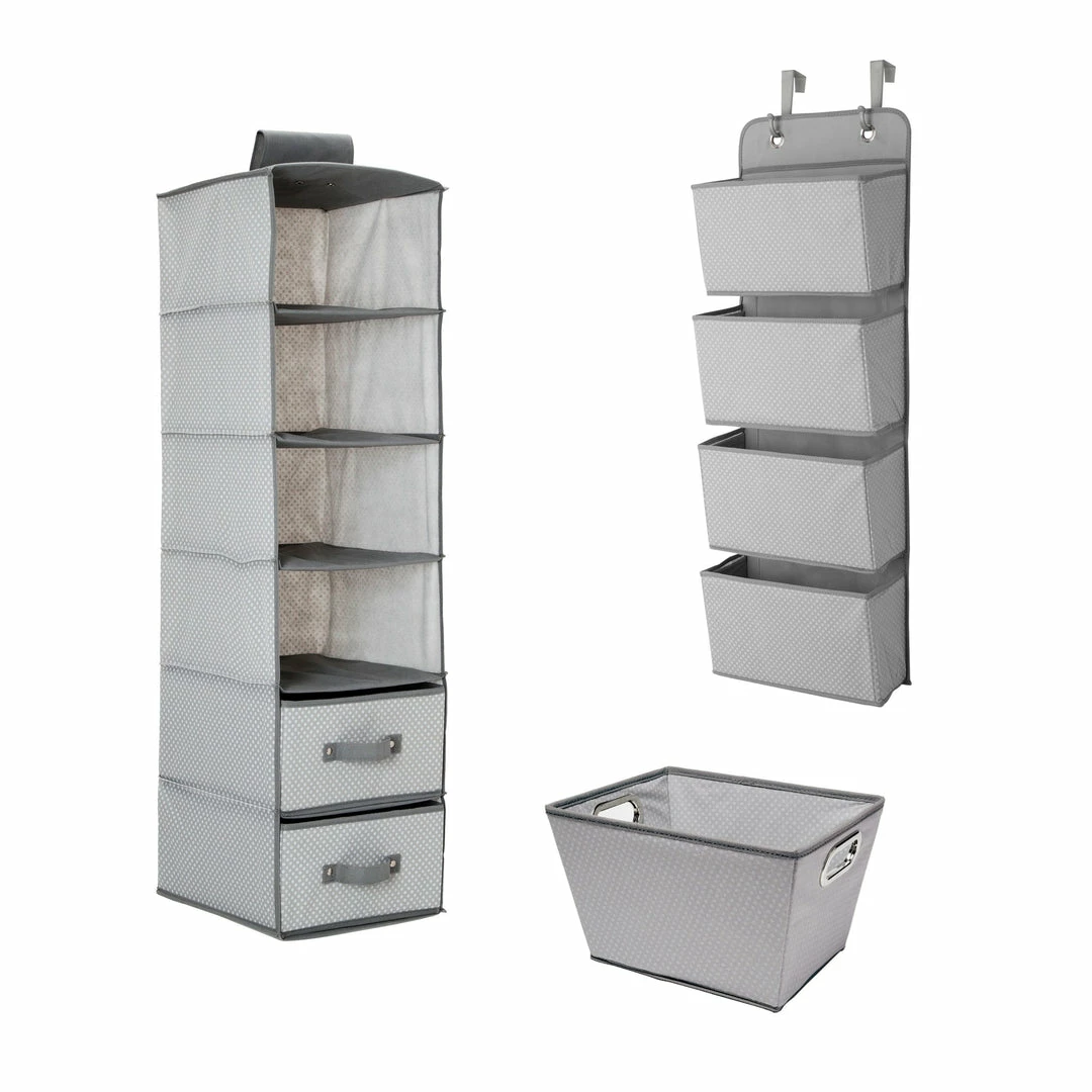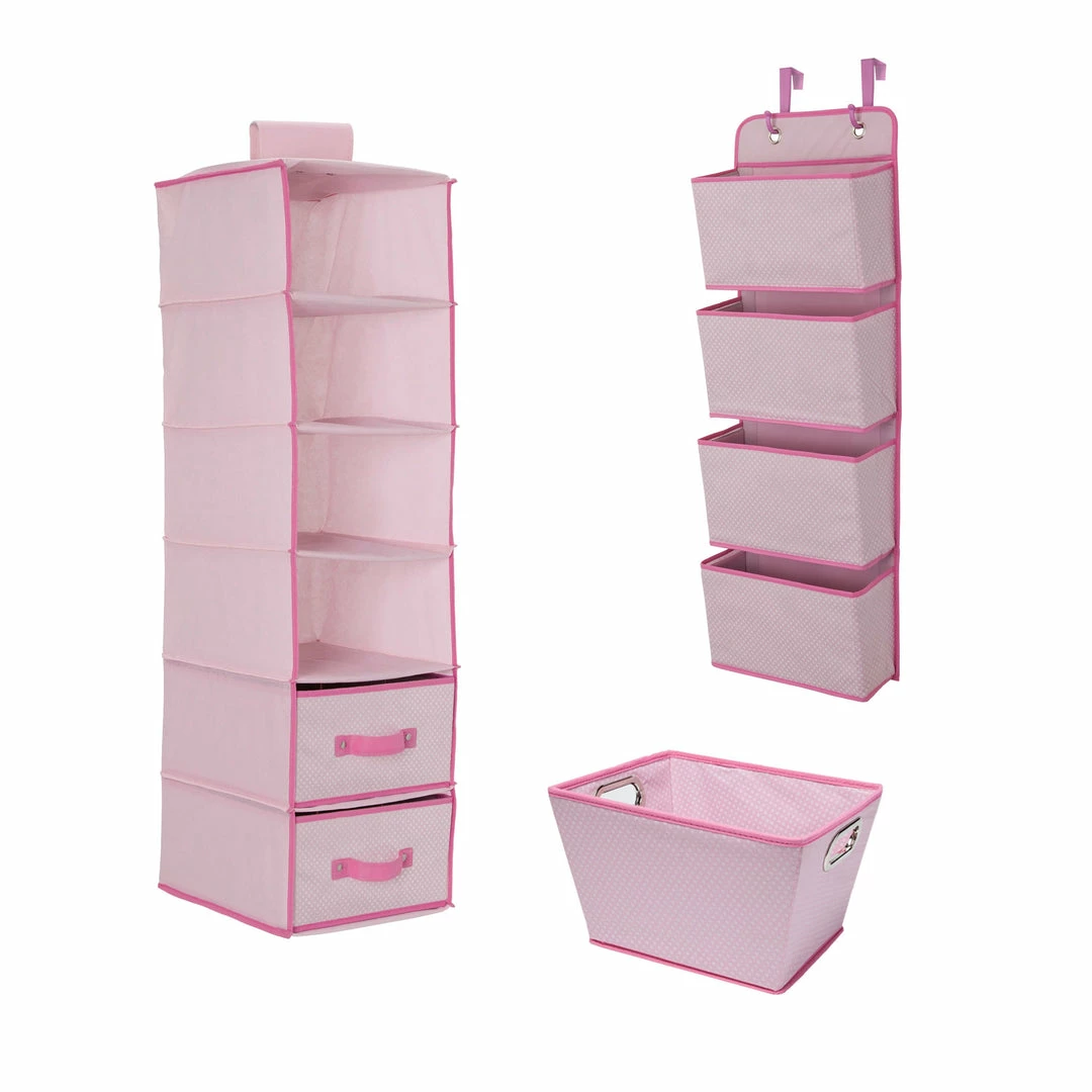 Create a perfectly ordered nursery with the Complete Nursery Organization ValuePack (3-Piece Set) from Delta Children. Make room for accessories and de-clutter toiletries with this versatile 3-piece organizer system. The set includes Delta’s most popular storage solutions: a 4 Pocket Over-The-Door Organizer, a 6 Shelf Storage with 2 Drawers that hangs on your closet rod and a Rectangle Tapered Tote. Helping you easily organize your child’s closet, changing table or dresser, this set keeps nursery essentials organized and within easy reach—a necessity for new parents. Accented with colorful patterns, the Complete Nursery Organization ValuePack (3-Piece Set) also makes a thoughtful baby shower gift.