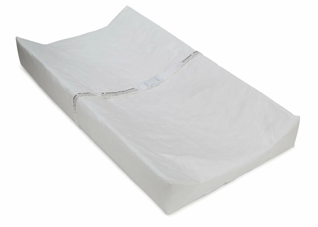 The supportive and secure Contoured Changing Pad by Delta Children provides a cozy place for baby to relax during diaper changes. Gently curved edges and a safety strap keep your little one in place while the foam and fiber core ensures long-lasting comfort. Topped with a waterproof cover that features a quilted, teddy bear pattern, this changing pad is easy to wipe clean. The Contoured Changing Pad by Delta Children is designed to fit most changing pad covers, dressers and changing tables, and securely attaches to furniture with fabric straps underneath the pad.