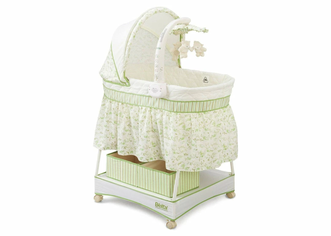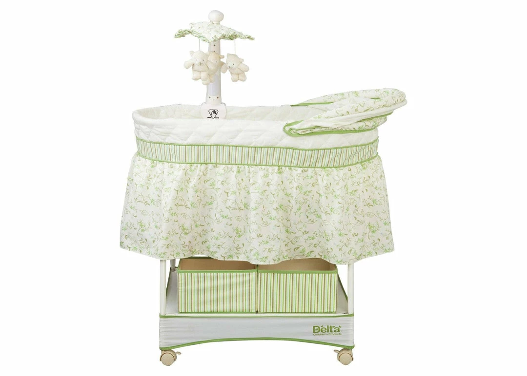As beautiful as it is practical, the Deluxe Gliding Bassinet from Delta Children will lull your little one to sleep with soothing music, soft nightlight and an electronic mobile accented with three plush bears. This safe, super-cozy bassinet outfitted with swivel wheels makes keeping baby close at night easy, while a large, two-section basket underneath provides extra storage for all of baby’s essentials. Includes a mattress pad and matching sheet. Machine washable sheet for easy cleaning.