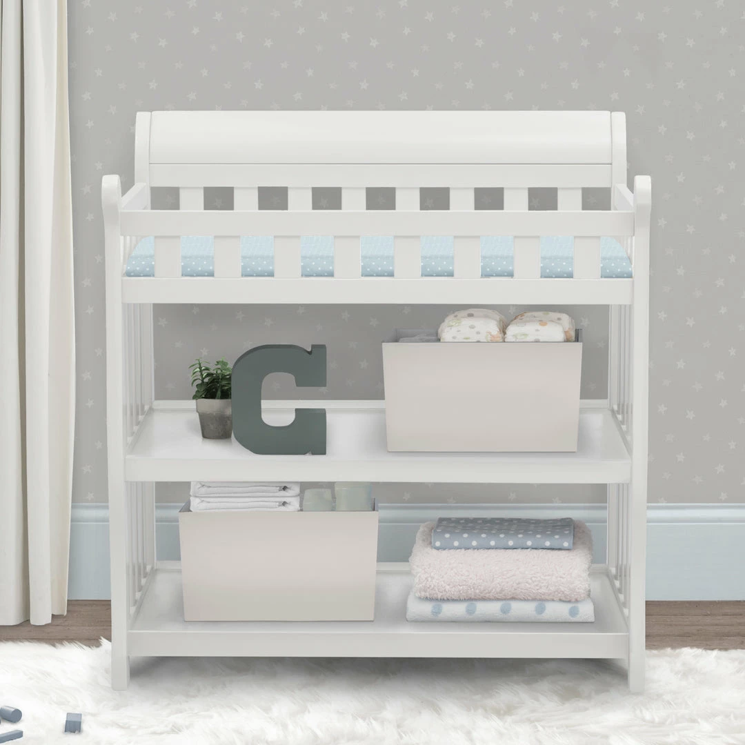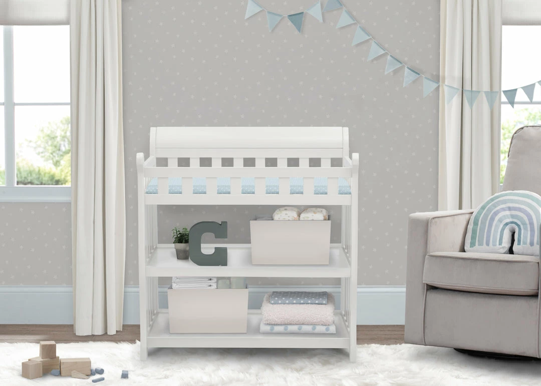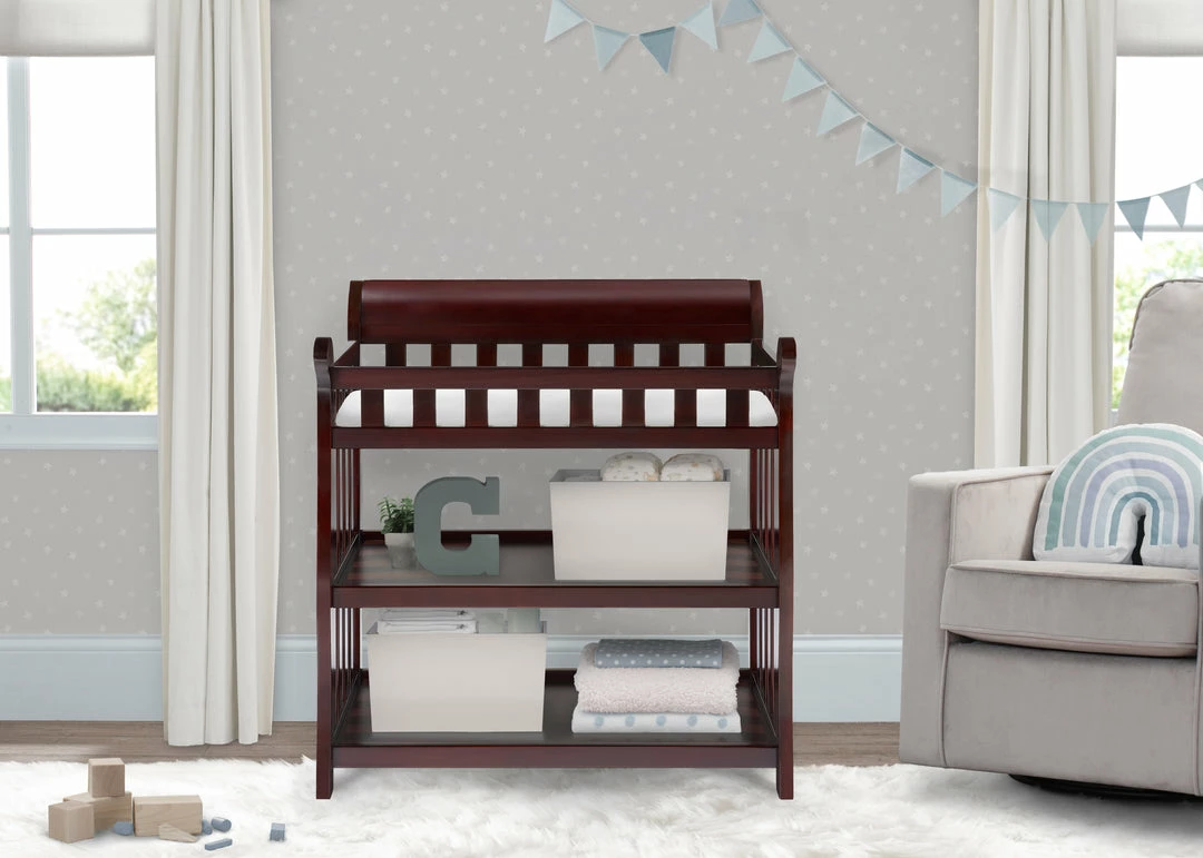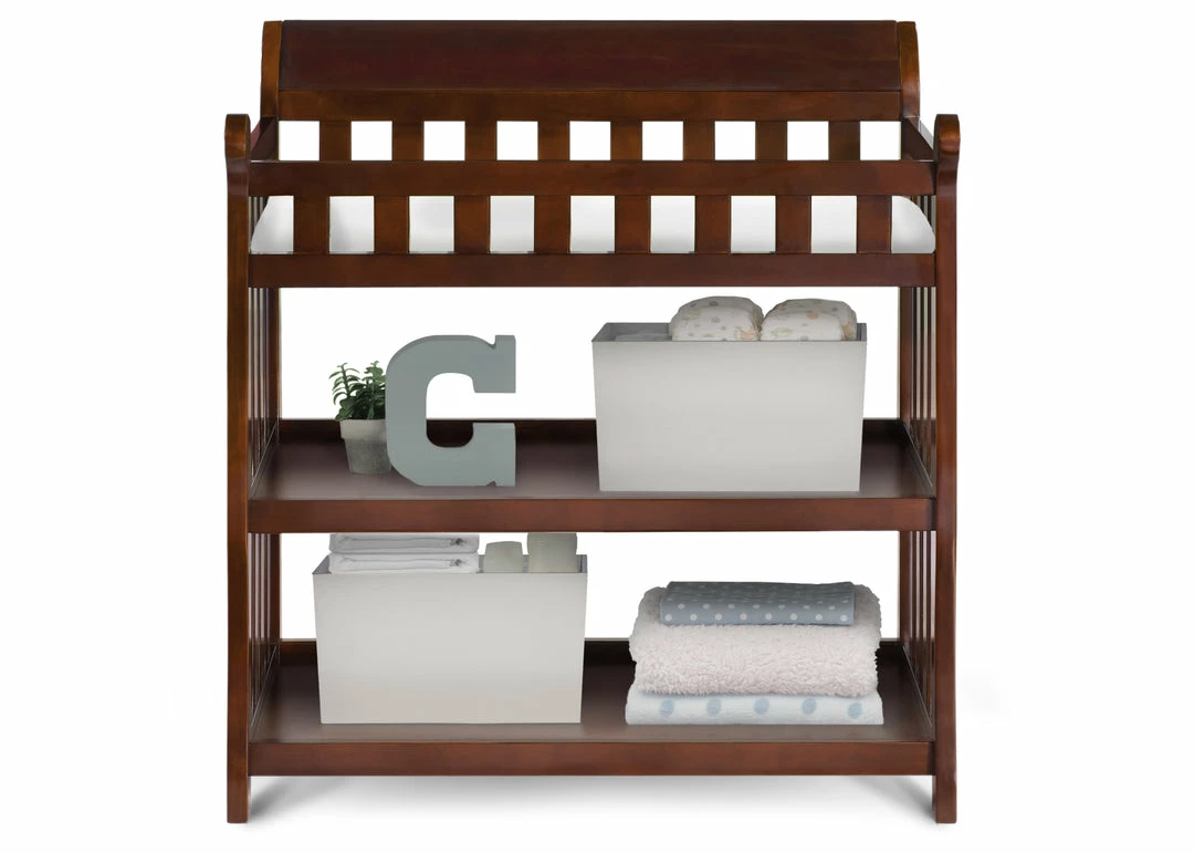 The Eclipse Changing Table with Pad from Delta Children is the perfect addition to your baby’s nursery. This beautiful and functional changing table offers generous open storage to keep necessities at your fingertips. Featuring four high sides for added security while changing or dressing your baby, this baby changing table is both functional and elegant. Water-resistant changing pad and safety strap is included. Coordinates with Delta Children cribs in the same finish.