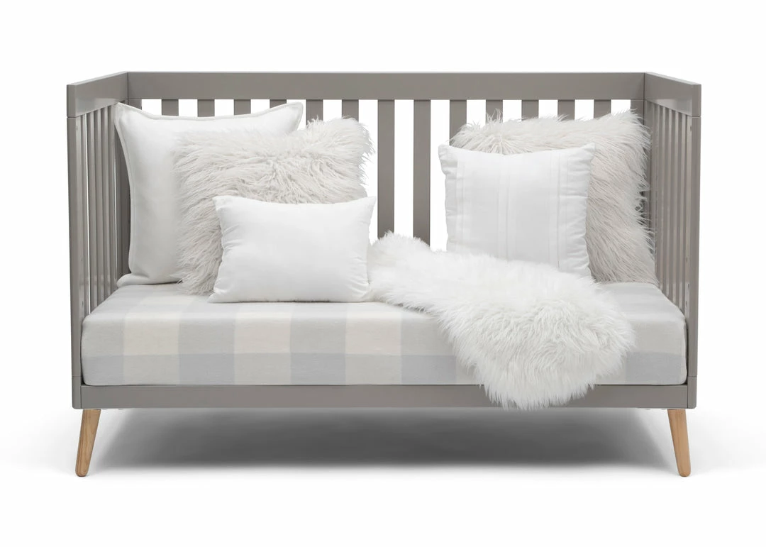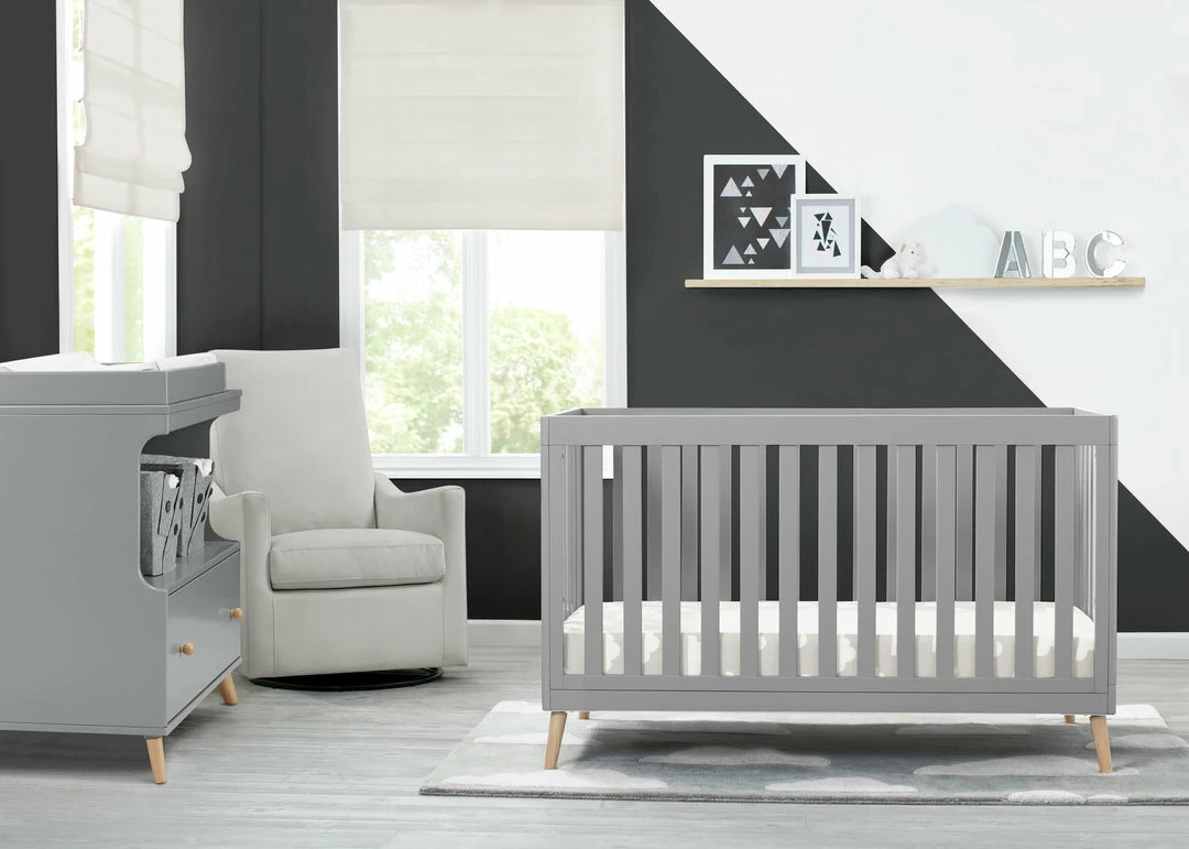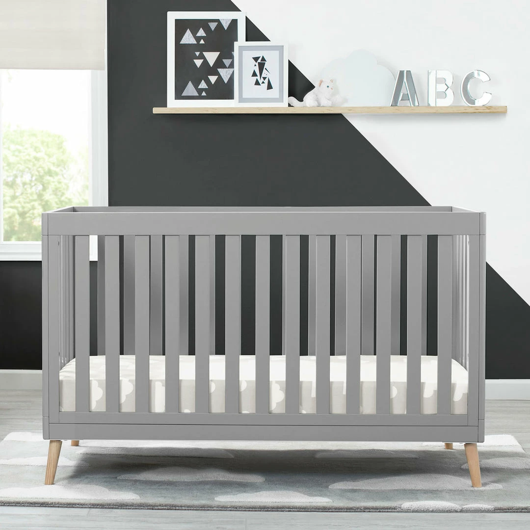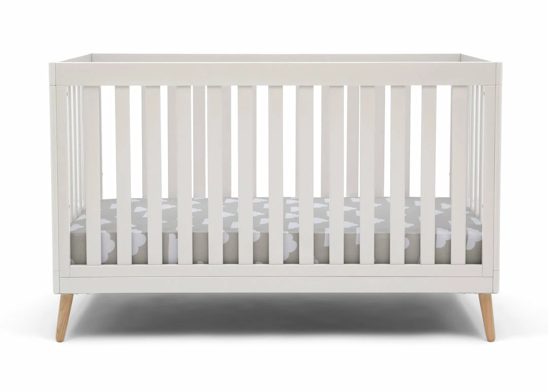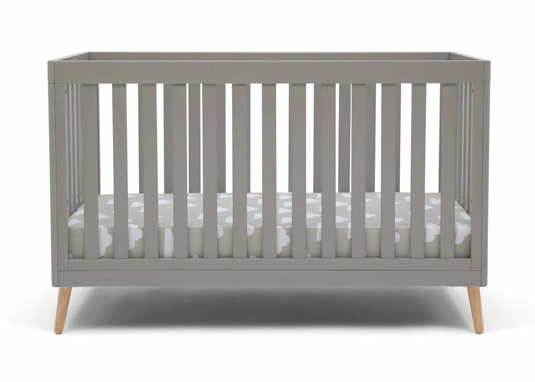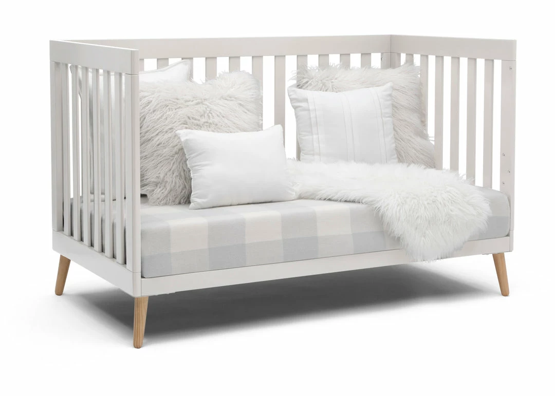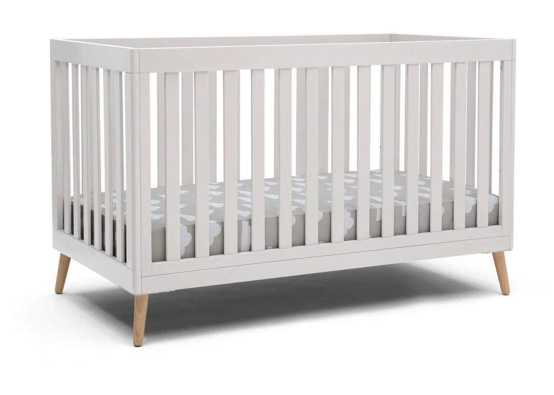 The Essex 4-in-1 Convertible Baby Crib by Delta Children is designed to elevate modern nurseries. It features gently curved corners and splayed feet in a natural finish for some retro cool contrast. The adjustable height mattress allows this crib to grow alongside your little one—start with the mattress at the highest level, then lower it as your baby begins to sit or stand. Once your child outgrows the crib, convert it to a toddler bed, daybed or sofa. To complete your mid-century modern nursery, pair the Essex 4-in-1 Crib with the Essex Changing Table/Bookcase by Delta Children.