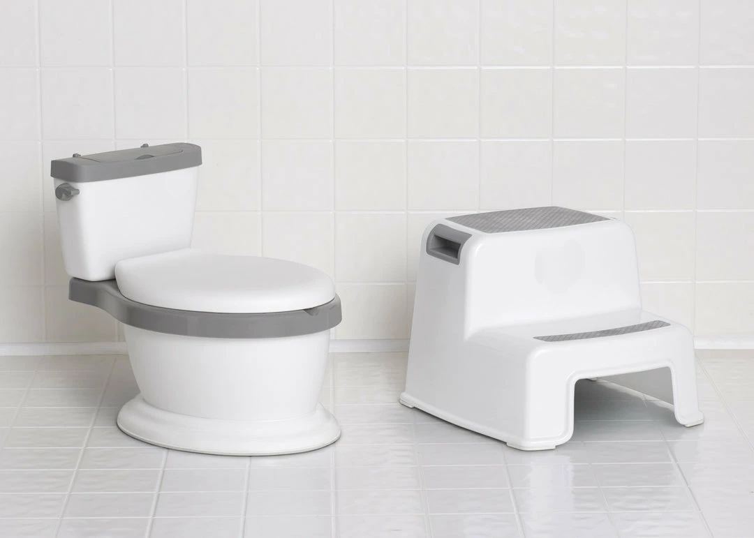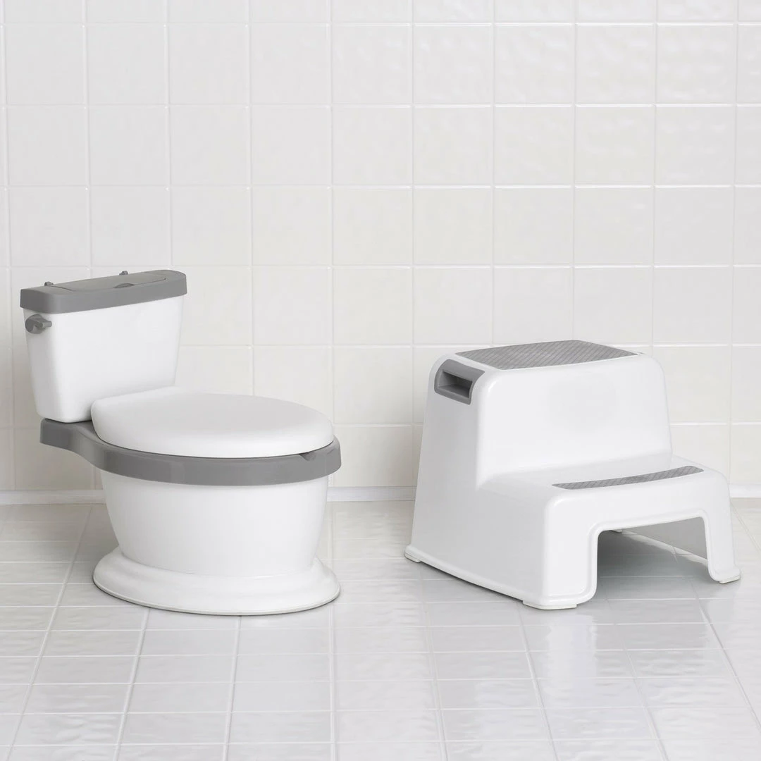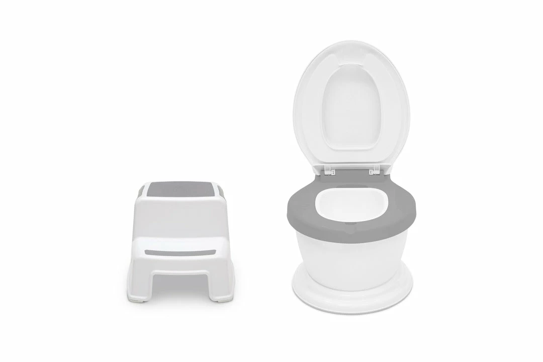 This versatile Kid Size Potty and Step Stool Set by Delta Children includes two potty training essentials, a realistic potty and step stool. The potty’s realistic design resembles an adult toilet, making it the perfect toilet training tool for your little one. Packed with a ton of features that help boost your child’s potty confidence, this training toilet features a flusher, full-size wipe compartment, soft foam seat and flip lid that opens and closes just like an adult toilet. What else makes this training toilet awesome? It’s so easy to clean! The potty’s non-slip feet prevent slipping and sliding, plus it features a removable bowl and integrated splash guard that makes it perfect for boys or girls to use. The included step stool allows kids to comfortably reach the toilet, stand at the bathroom counter to wash their hands, brush their teeth or help out mom and dad in the kitchen. The step stool features non-slip feet that provide a secure surface on all floor types. It also has soft-grip steps, giving children the comfort and support they need. The dual height design accommodates different ages and heights, toddlers can use the top step as they potty train while older children can use the bottom step in the kitchen or beyond. Get the Kid Size Potty and Step Stool Set by Delta Children when it’s time for your little one to start their potty-training journey—it will help them conquer toilet training easily and quickly!