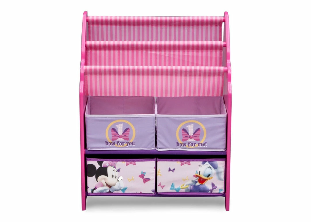 Bring a spot of color to your girl’s bedroom or playroom with this Minnie Mouse Book & Toy Organizer from Delta Children! Featuring four fabric bins and a two-tiered bookrack supported by a sturdy wood frame, it’s finished with colorful illustrations of Minnie Mouse and her iconic polka dots.