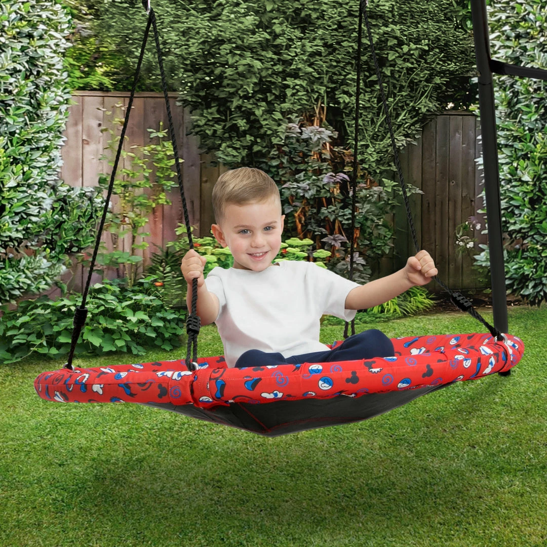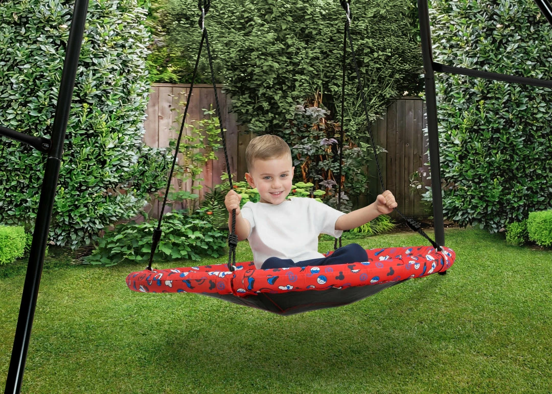 Oh boy! The Disney Mickey Mouse Saucer Swing for Kids by Delta Children brings swinging fun to your backyard. This saucer-shape swing can fit up to two children (250 pounds total) and is easy to hang just about anywhere, simply attach the included rope and hardware to your existing swing set or a tree. With swinging, spinning and soaring, this disc swing is the ideal toy to encourage gross motor skills, coordination, balance, cooperative play, outdoor play and exercise. And, don’t worry about leaving it outside, its weather-resistant construction can withstand years of outdoor use. Get it today and bring home the magic of Mickey Mouse and endless good times! This swing is recommended for ages 3+. Includes all hardware needed for installation.