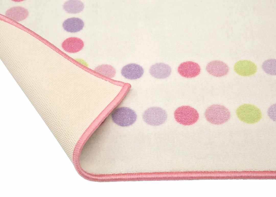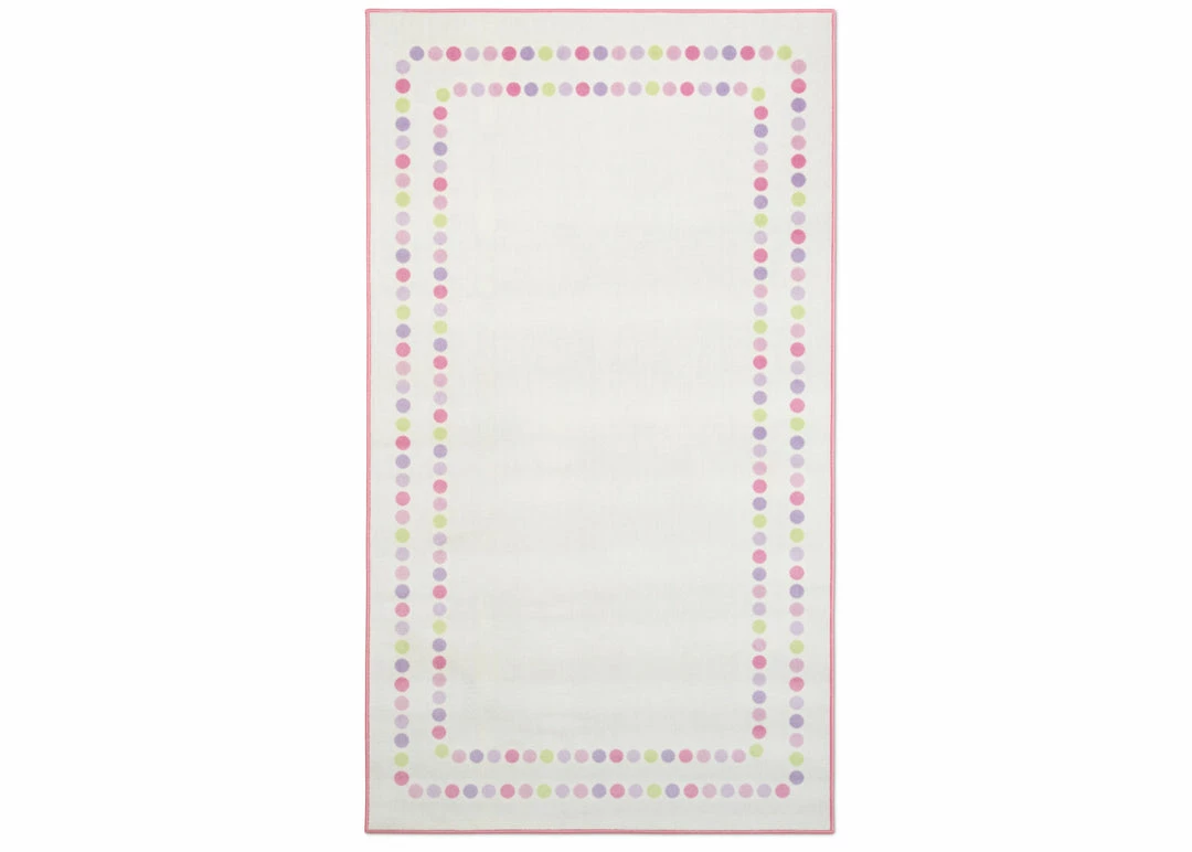 Add timeless style you your little one’s space with this Pearl Dot Rectangle Area Rug by Delta Children. This fun rug features a double row of polka dots in pastel colors along the border. A great option for your child’s bedroom or playroom, this generously sized area rug is made from soft and durable materials to ensure it’s the perfect place to sit and play or read. The rug’s non-slip latex backing makes it safe to use on types of flooring and reinforced borders prevent fraying.