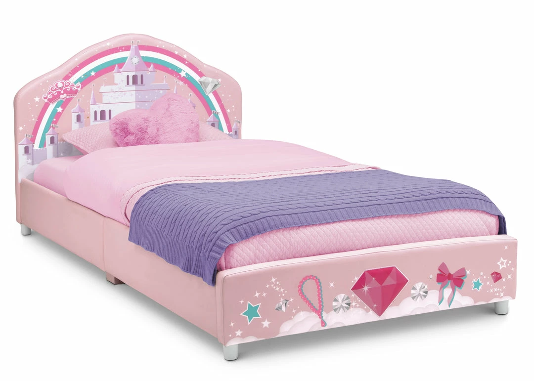This Princess Upholstered Twin Bed by Delta Children will instantly give any bedroom a regal makeover. An enchanted choice for your child, it features a big castle on the headboard and three-dimensional diamond on the footboard. Fully upholstered in faux leather with a sturdy and durable hardwood frame, this kids’ bed creates a magical and safe sleep space that is comfier than you can even imagine. No box spring required. Mattress not included.