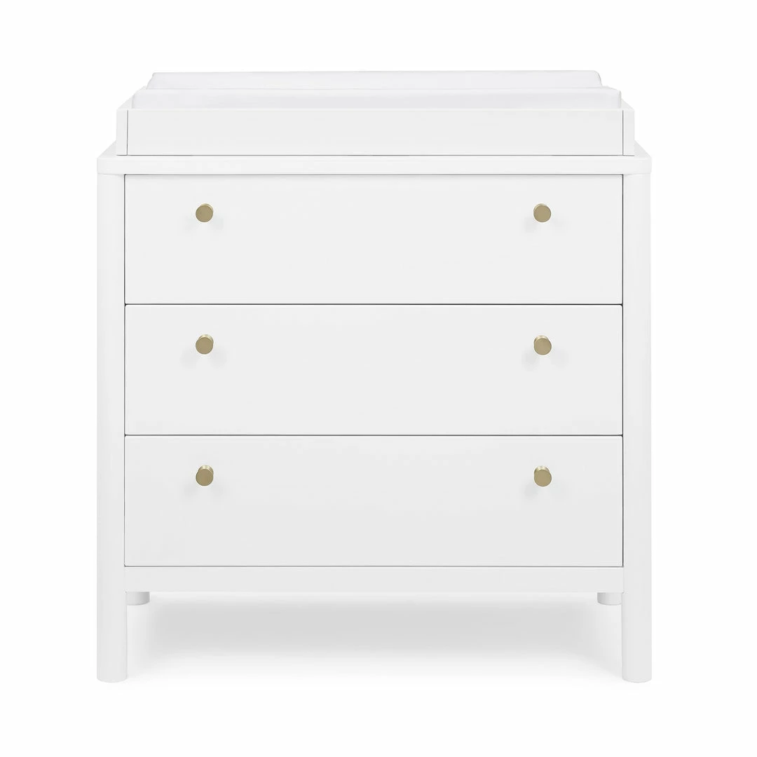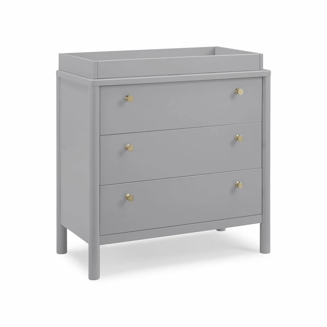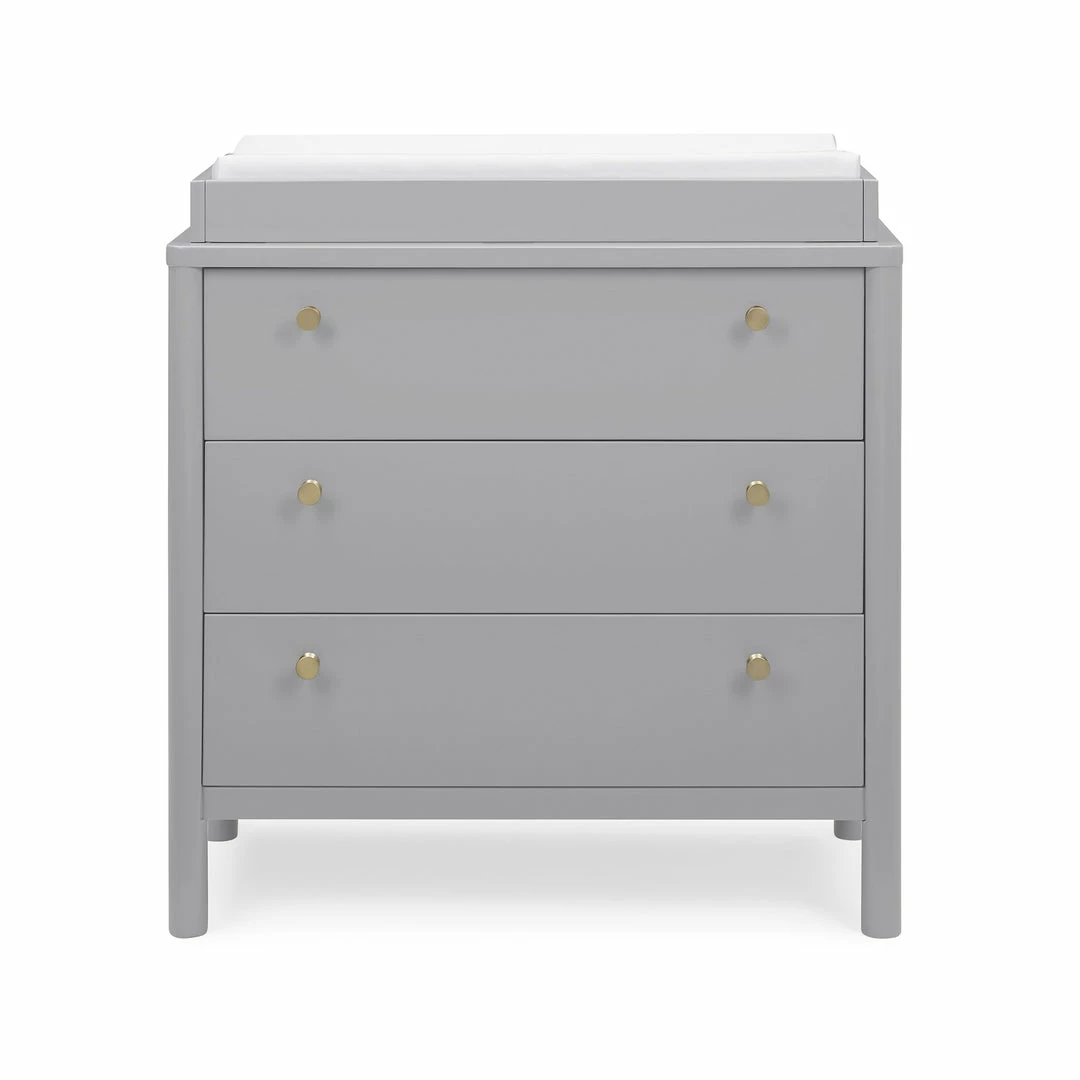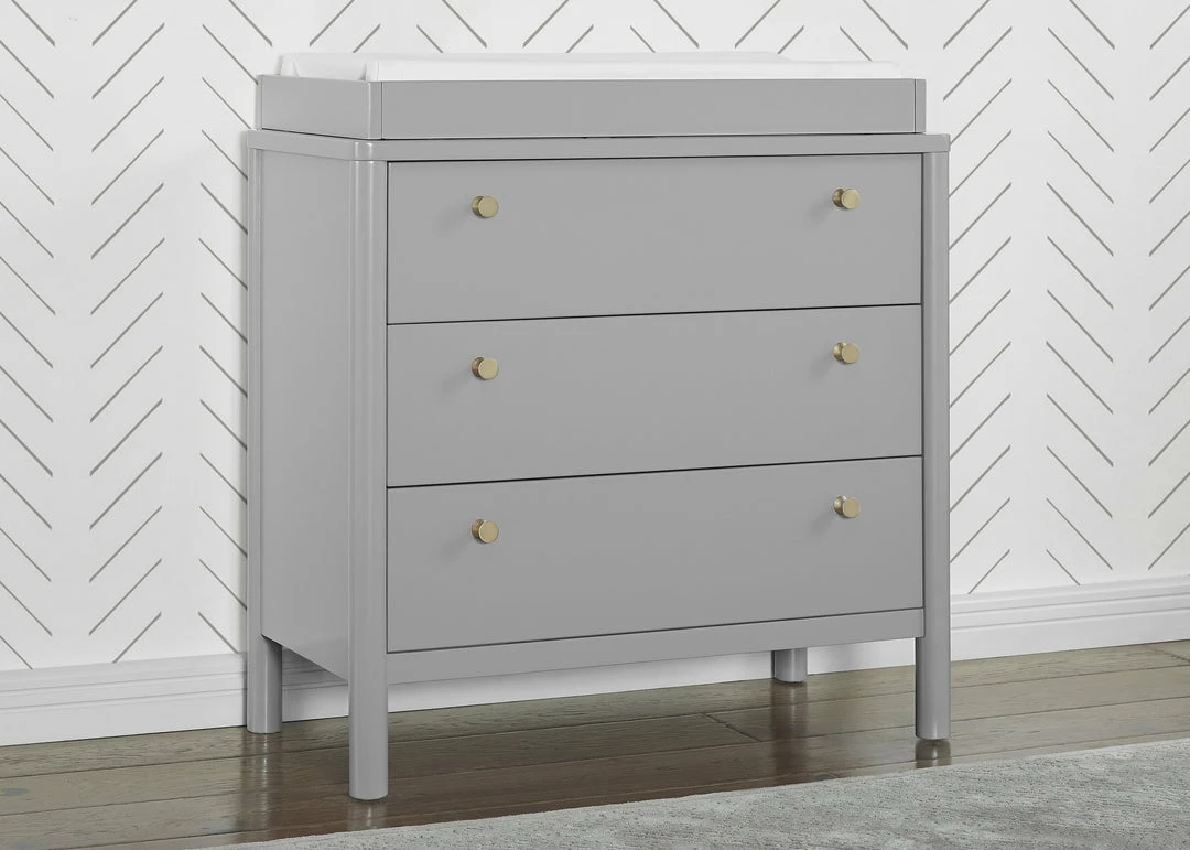 The Remy 3 Drawer Dresser with Changing Top by Delta Children will instantly elevate your nursery with its mid-century modern style. Our updated take on retro features clean lines, brass knobs and three spacious soft-close drawers framed by cylindrical posts. Built to grow with your child, the Remy includes a removable changing top that creates the perfect space for diaper changing sessions now and is easily detachable, so you can create a more grown-up space later on. Pair this dresser with other pieces in the Remy Collection for a coordinated look.