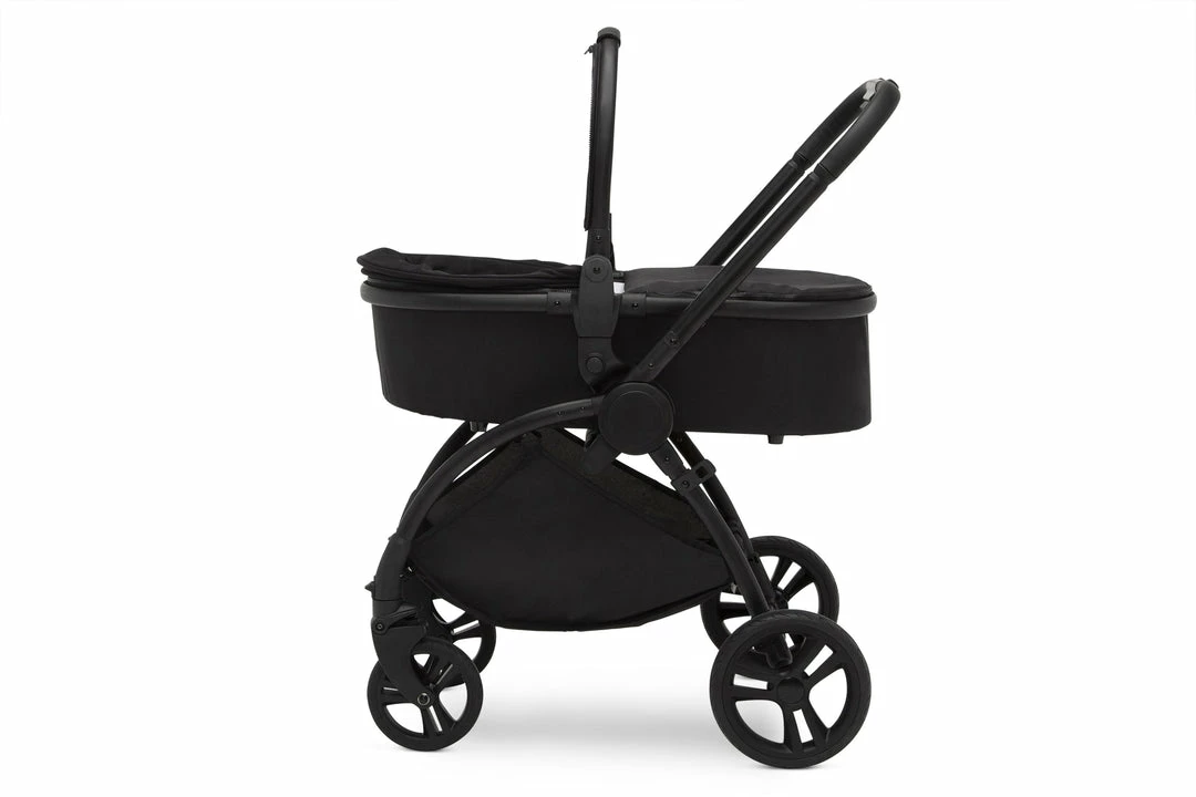 Adding the Revolve Carriage/Pram to your Delta Children Revolve Stroller is the coziest way to stroll around town with your newborn. This cozy infant carriage seamlessly attaches to the Revolve Stroller, both forwards and backwards. Designed with comfort in mind, this bassinet features a waterproof mattress pad, full coverage canopy, and lets your baby sleep soundly while laying completely flat. It also includes a sunshade attachment with UPF 30+ that completely blocks out all light. The zippered foot cover will protect baby from the sun or cold weather. Topped with a luxe leather wrapped carry handle that makes it easy to attach and detach.