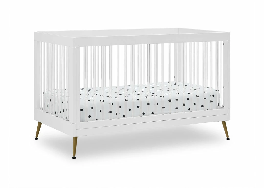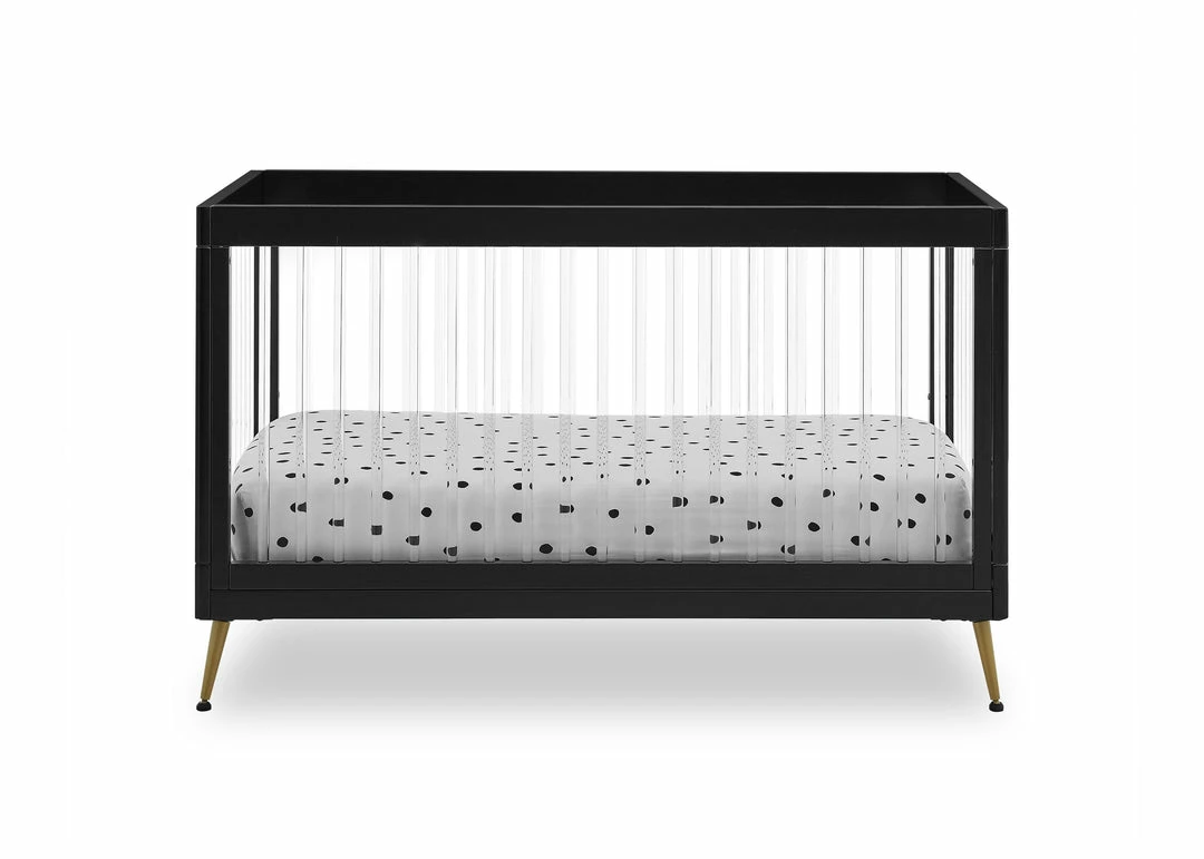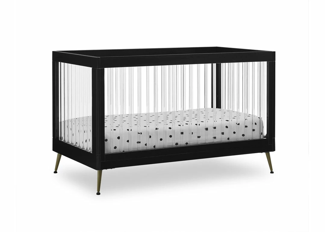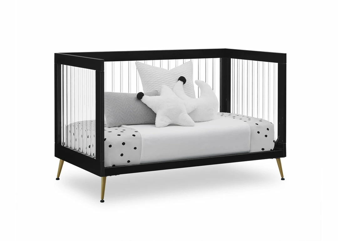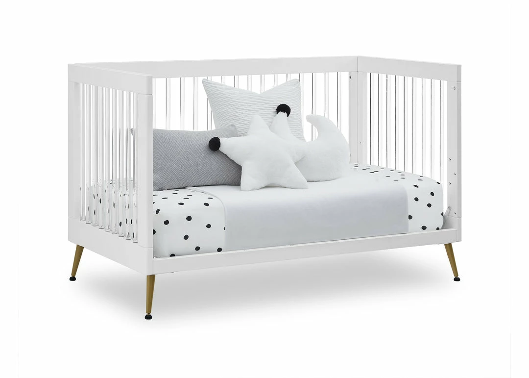 The Sloane 4-in-1 Acrylic Convertible Crib by Delta Children is the clear choice for your baby’s modern nursery! Its unique design features clear acrylic spindles that provide an open, airy feel while the splayed bronze feet add some polish to the clean lines. And if that’s not enough, it even converts from crib to a toddler bed, sofa and daybed, making this a versatile bed that grows with your child (conversion rail included). To complete your nursery, pair with the coordinating Sloane 4 Drawer Dresser.