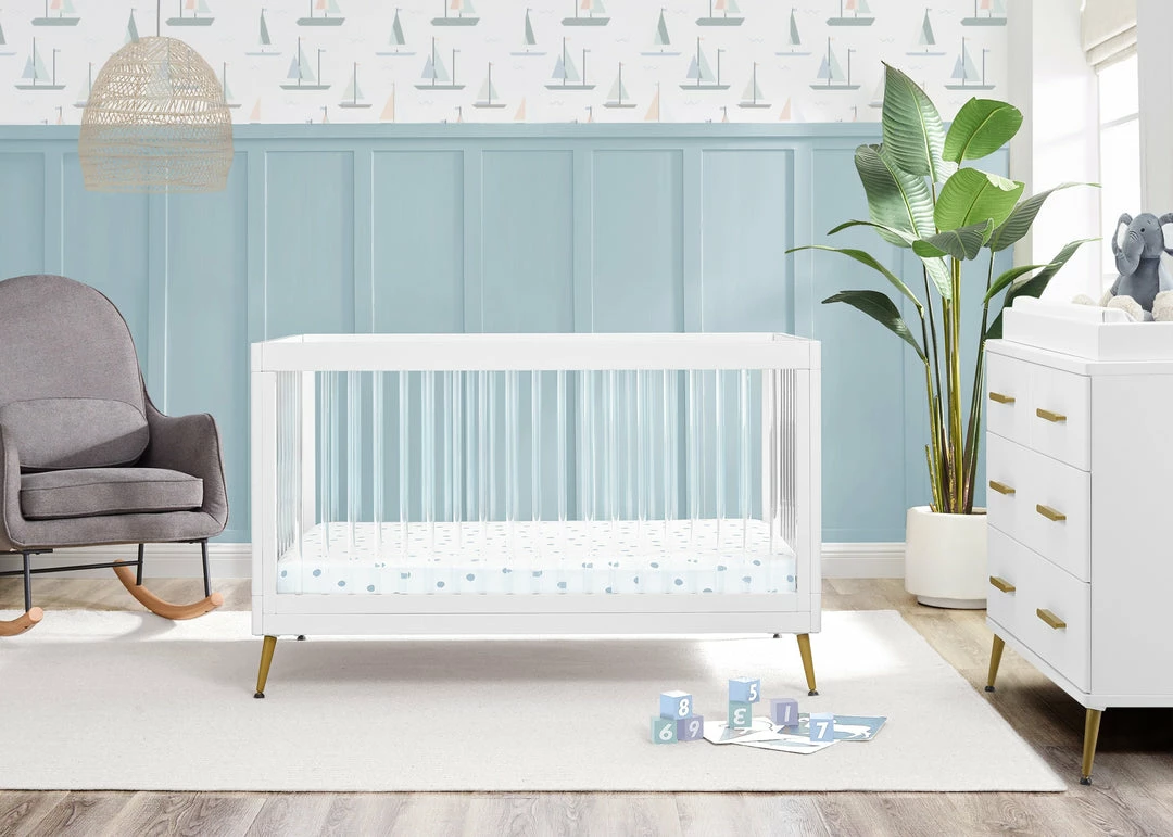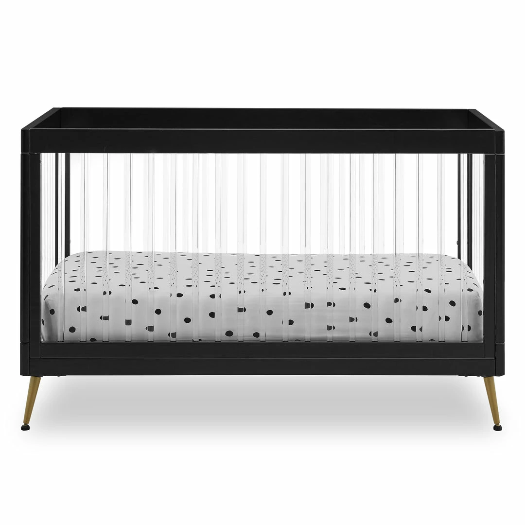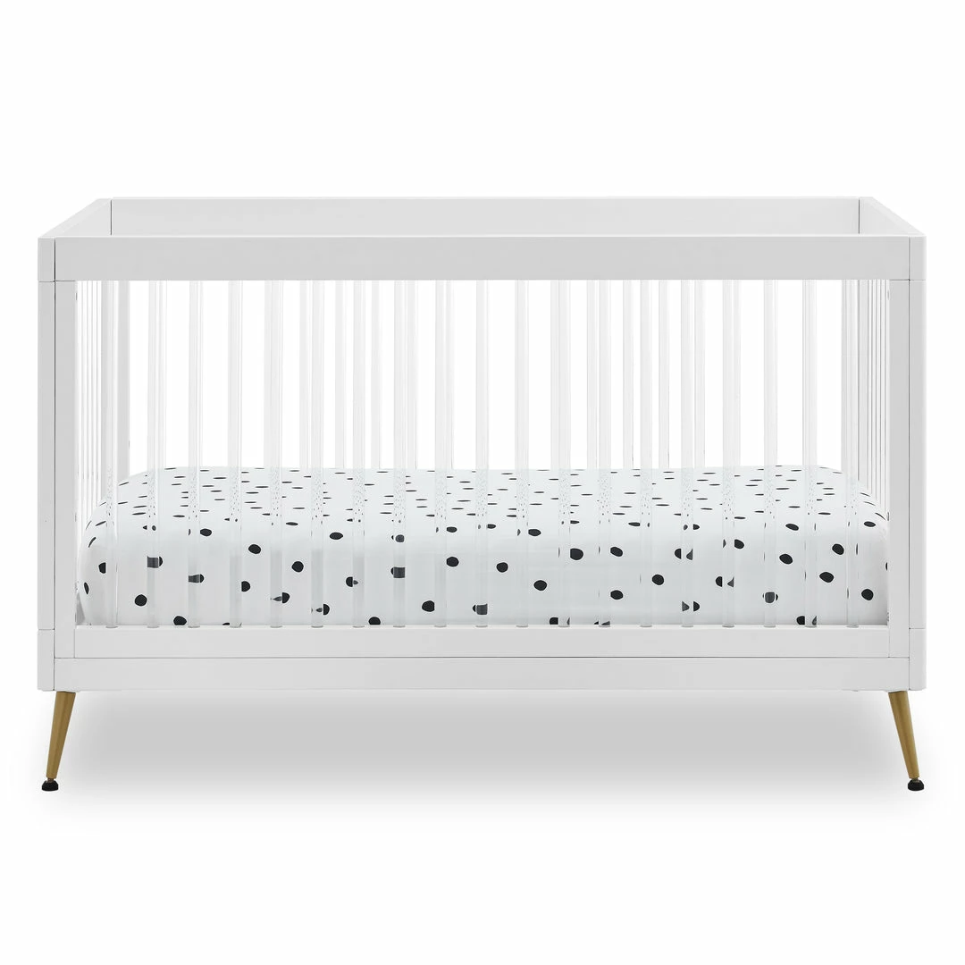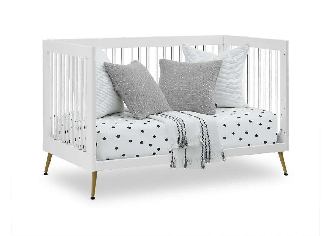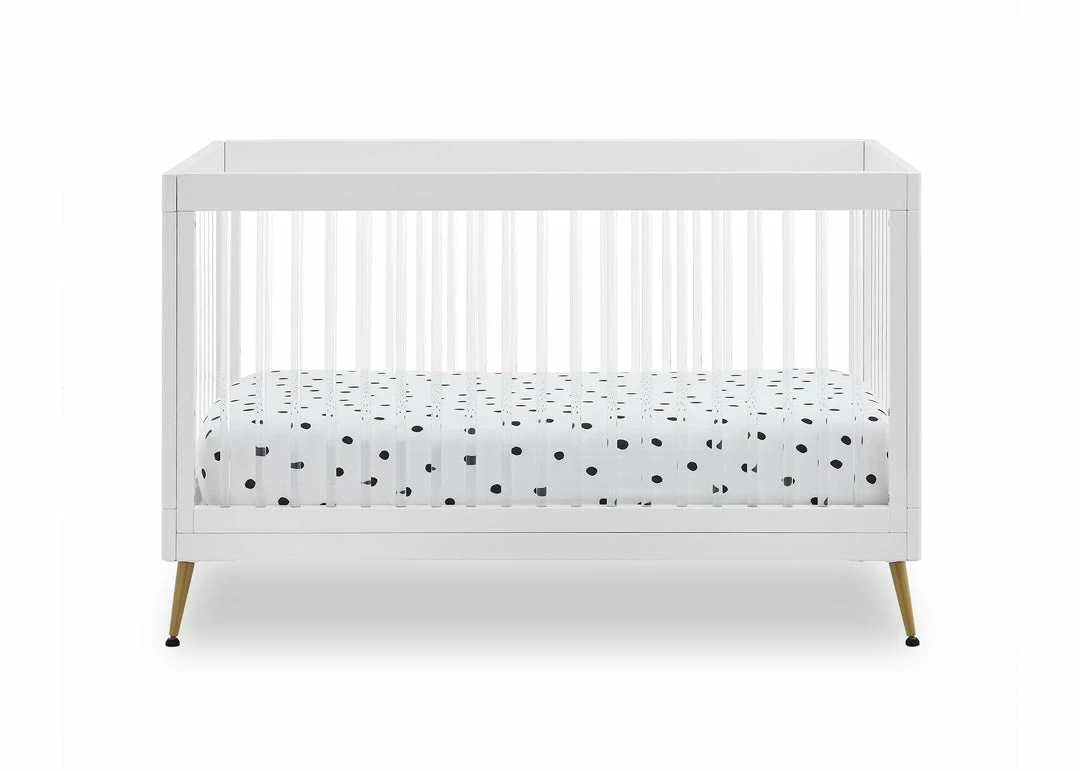 The Sloane 4-in-1 Acrylic Convertible Crib by Delta Children is the clear choice for your baby’s modern nursery! Its unique design features clear acrylic spindles that provide an open, airy feel while the splayed bronze feet add some polish to the clean lines. And if that’s not enough, it even converts from crib to a toddler bed, sofa and daybed, making this a versatile bed that grows with your child (conversion rail included). To complete your nursery, pair with the coordinating Sloane 4 Drawer Dresser.