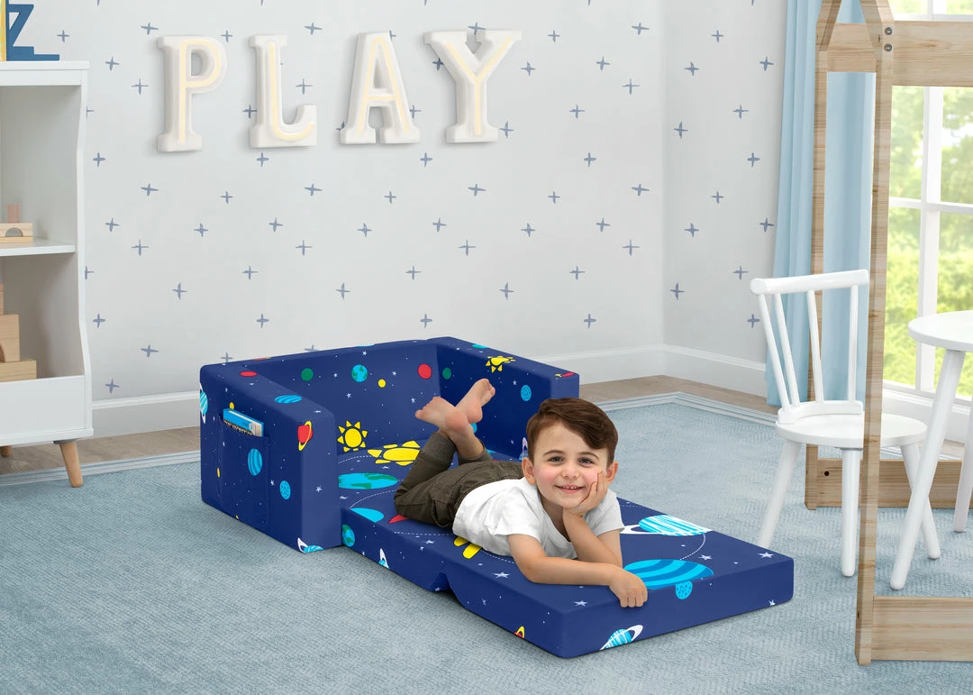 The Cozee 2-in-1 Flip-Out Convertible Chair to Lounger by Delta Children is a cozy chair by day, laid-back lounger by night. This convertible seat easily flips open to reveal multiple ways for your child to relax–they’ll love to sit and read or watch their favorite movies on the chair but when it’s time for a nap, this seat folds out into a comfy sleeper bed. Big enough to fit two small kids comfortably in sofa mode, it’s light enough to move around the house and is ideal for your children to share during playtime or sleepovers. The super-soft slipcover with easy-to-reach side pocket is treated with a Scotchgard stain release finish to resist stains, ensuring the chair looks beautiful for years to come! The supportive foam construction will keep its shape and provides all-day comfort. Designed to ship in a super-small box, this lightweight foam kids’ chair and lounger may take up to 24 hours to fully expand once unboxed. Machine-washable slipcover zips off for easy cleaning. Recommended for ages 18 months+.