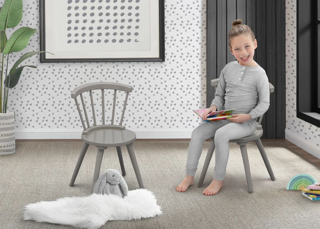 Have a seat (or two) with this Windsor 2-Piece Chair Set by Delta Children. These sturdy wooden chairs are designed in a traditional style and feature a recognizable Windsor silhouette with vertical spokes and curved backs. Sized just right for your growing child, the 12-inch seat height of these kids’ chairs ensure they can be used for many years. To complete your play space, pair these chairs with Windsor Table and Chair Set (sold separately) or any other play table of your choice.