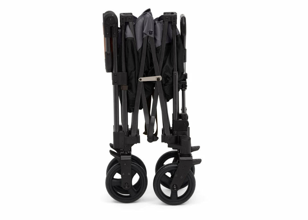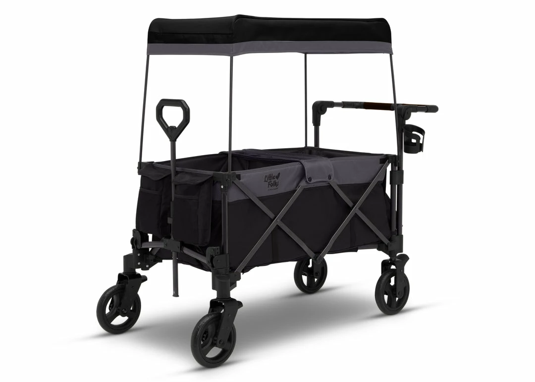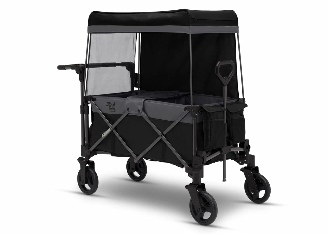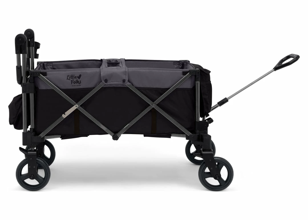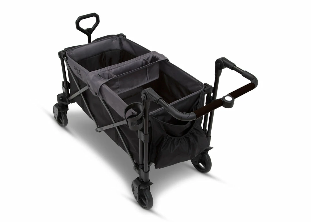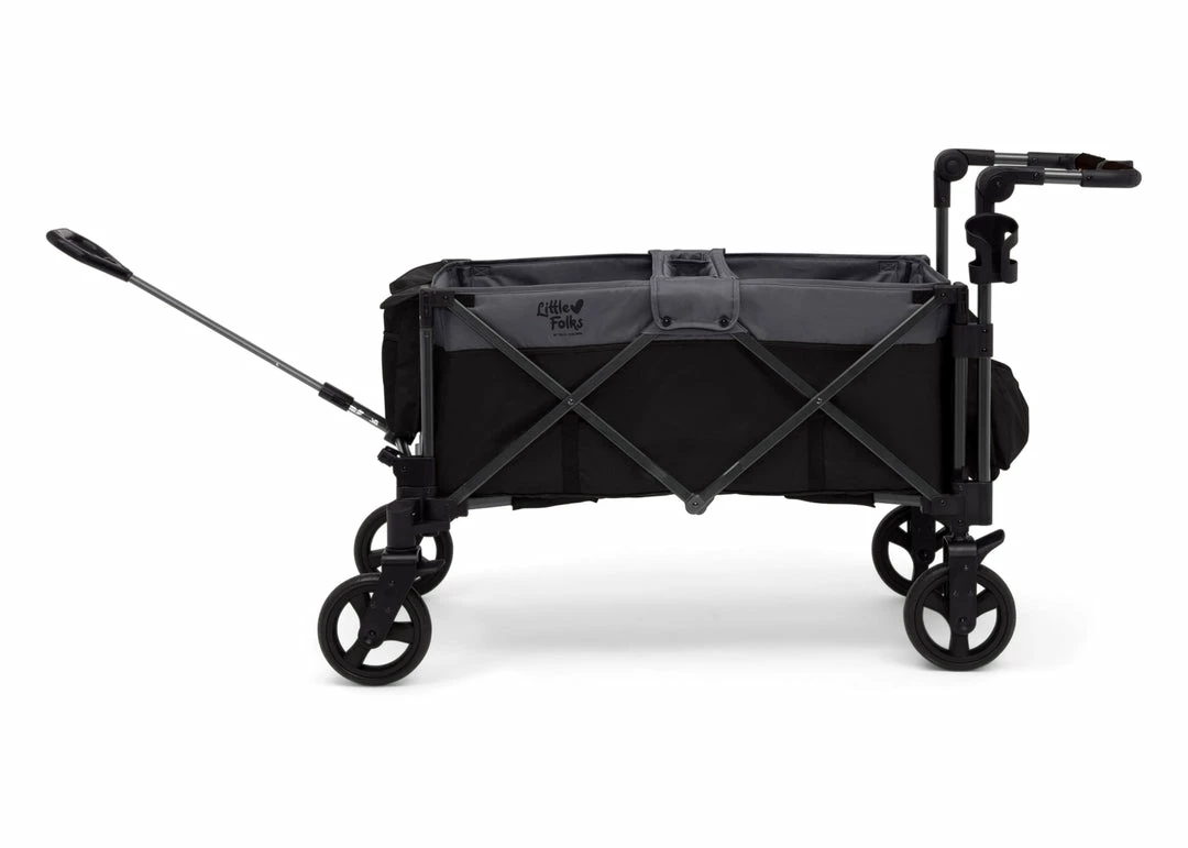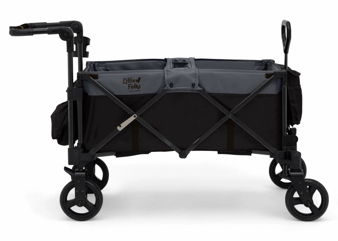 The Little Folks City Wagon Cruiser by Delta Children is specifically designed to grow and flow with your family. Packed with more features than a standard double stroller, this convenient wagon is perfect for indoor or outdoor activities. A comfy option for siblings or friends, this stroller wagon features two cushioned seats with 3-point safety harnesses for security while the removable center console with two cup holders and storage pocket allows kids to share snacks, toys and drinks. An additional cup holder for parents and side pockets ensure you can bring everything you need along for the adventure. The removable, UV blocking canopy and roll-down shades offer privacy and protection from the sun or rain. Easy to drive, it features swivel front wheels that allow you to effortlessly turn and pivot, as well as push and pull handles with adjustable heights. The wagon’s compact fold makes it easy to store or transport. And when your children outgrow the need for a wagon, use it to haul your own gear at the farmers market, while gardening or the grocery store. Holds up to 110 lbs. (55 lbs. per seat). Weighs 36.3 lbs. Recommended for ages 9 months up to 55 lbs.
