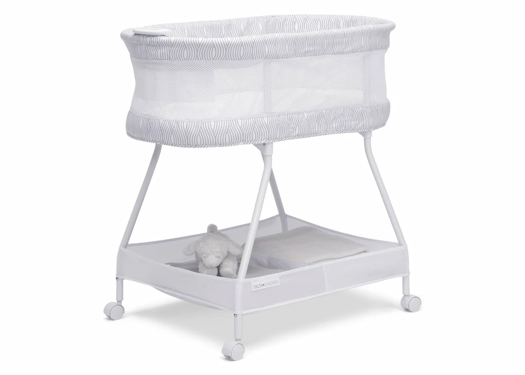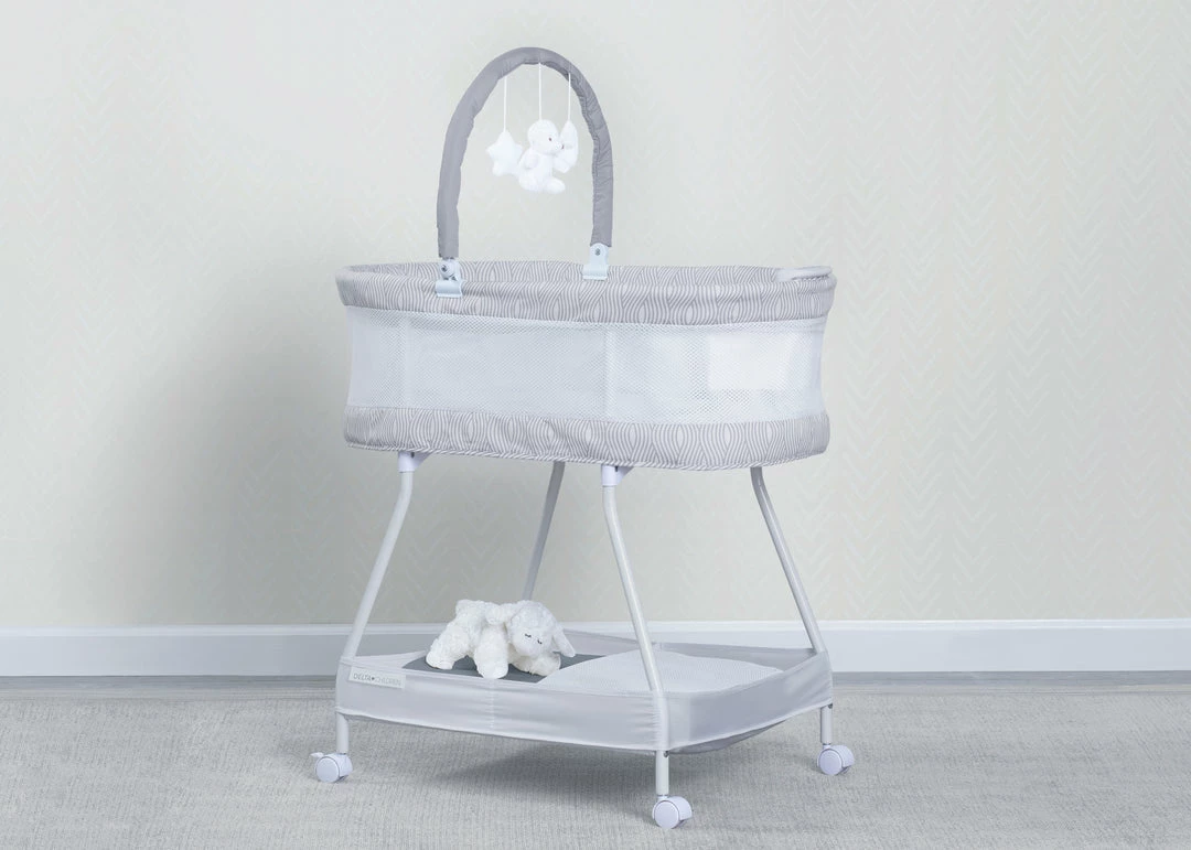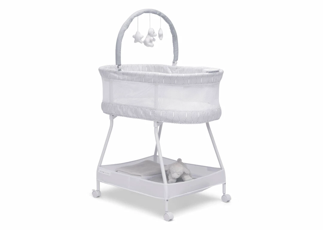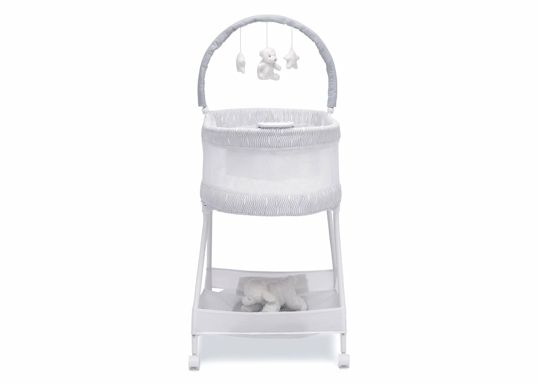 The Wave Bassinet by Delta Children is designed to help your little one fall asleep faster and stay asleep. This must-have bassinet features a control panel at the front with vibration, nightlight and soothing sounds to lull your newborn to sleep while mesh sides provide open airflow for breathability and a clear view of your baby. For your convenience, the adjustable toy bar provides entertainment if your baby wakes, lockable wheels make it easy to move around the house, and the easy-to-reach storage basket keeps changing essentials within reach. The Wave Bassinet by Delta Children is the easiest way stay safely connected and close to your baby during their first few months, and the modern wave print on the trim looks great in your master bedroom while room sharing or in your baby’s nursery. This bassinet is recommended for babies 0-5 months or up to 30lbs. Stop use at 5 months or once your infant begins to push up on their hands and knees, whichever comes first.