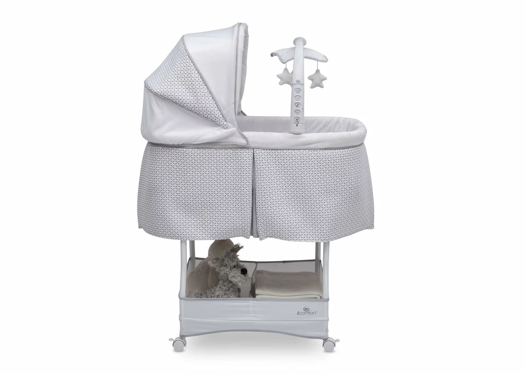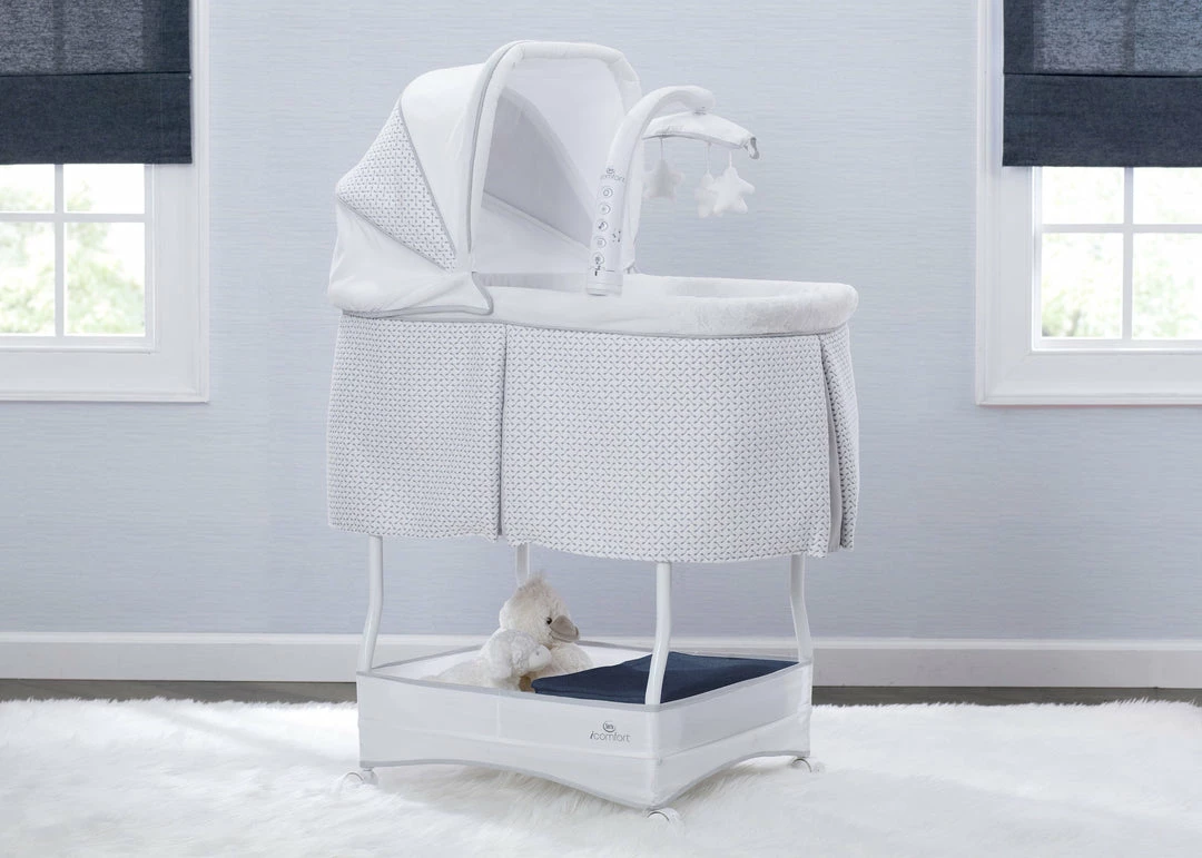 Help ease your baby to sleep with the automatic gliding motion, soothing sounds, spinning star toys, twinkling lights and soft-glow nightlight on the Serta iComfort Auto Gliding Bassinet. Activate the bassinet’s whisper-quiet gliding motion with a push of a button—the smooth sway creates a serene sleep space. The modern grey and white pattern on plush fabrics will be at home anywhere, from the nursery to the family room and the parents’ bedroom. Locking wheels, a light blocking canopy and foam mattress pad means your newborn can sleep by your side, no matter where you are in the house. Plus, the removable fitted sheet is machine washable for easy care. Brought to you by Serta, the leader in mattress innovation and technology, this bassinet will make it easier than ever for baby to fall asleep and stay asleep throughout the night. This bassinet is recommended for babies 0-5 months. Stop use at 5 months or once your infant begins to push up on their hands and knees, whichever comes first. Use the included AC adapter for battery free operation.
