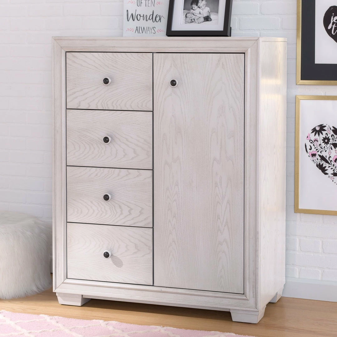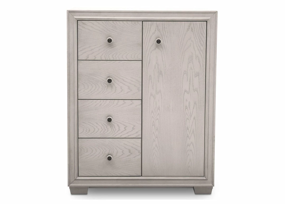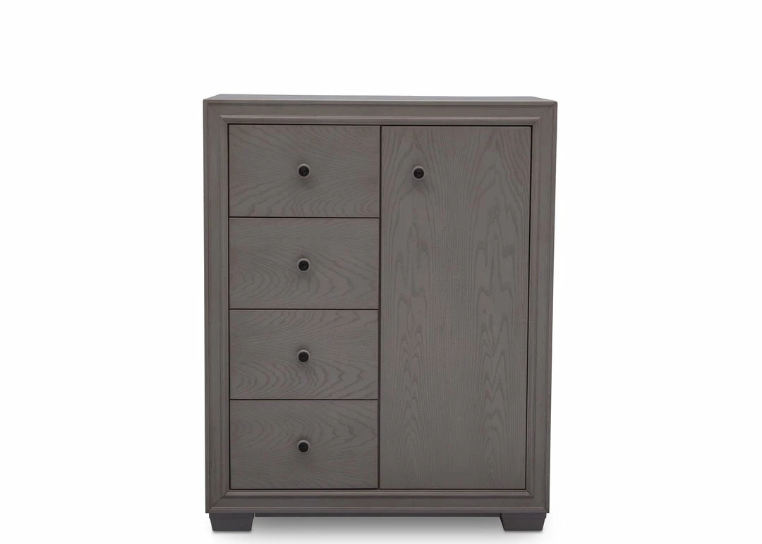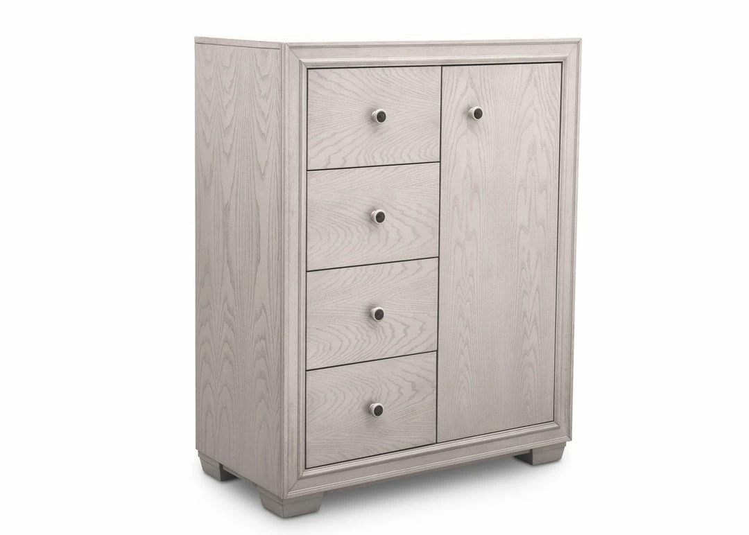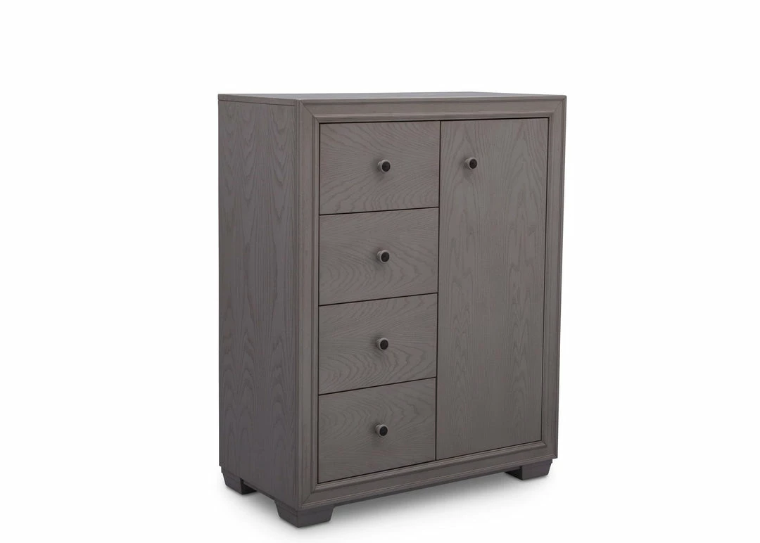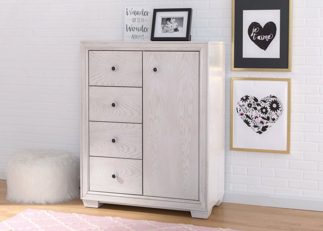 The Ravello 4 Drawer Combo Chest from Simmons Kids will fill your nursery with a sense of warmth. From an antique finish to a solid wood frame construction, this versatile storage unit channels the charm of the Italian coast. Four drawers with soft close drawer glides and a separate closet space with hanging bar will keep clothes and accessories tidy and out of sight.