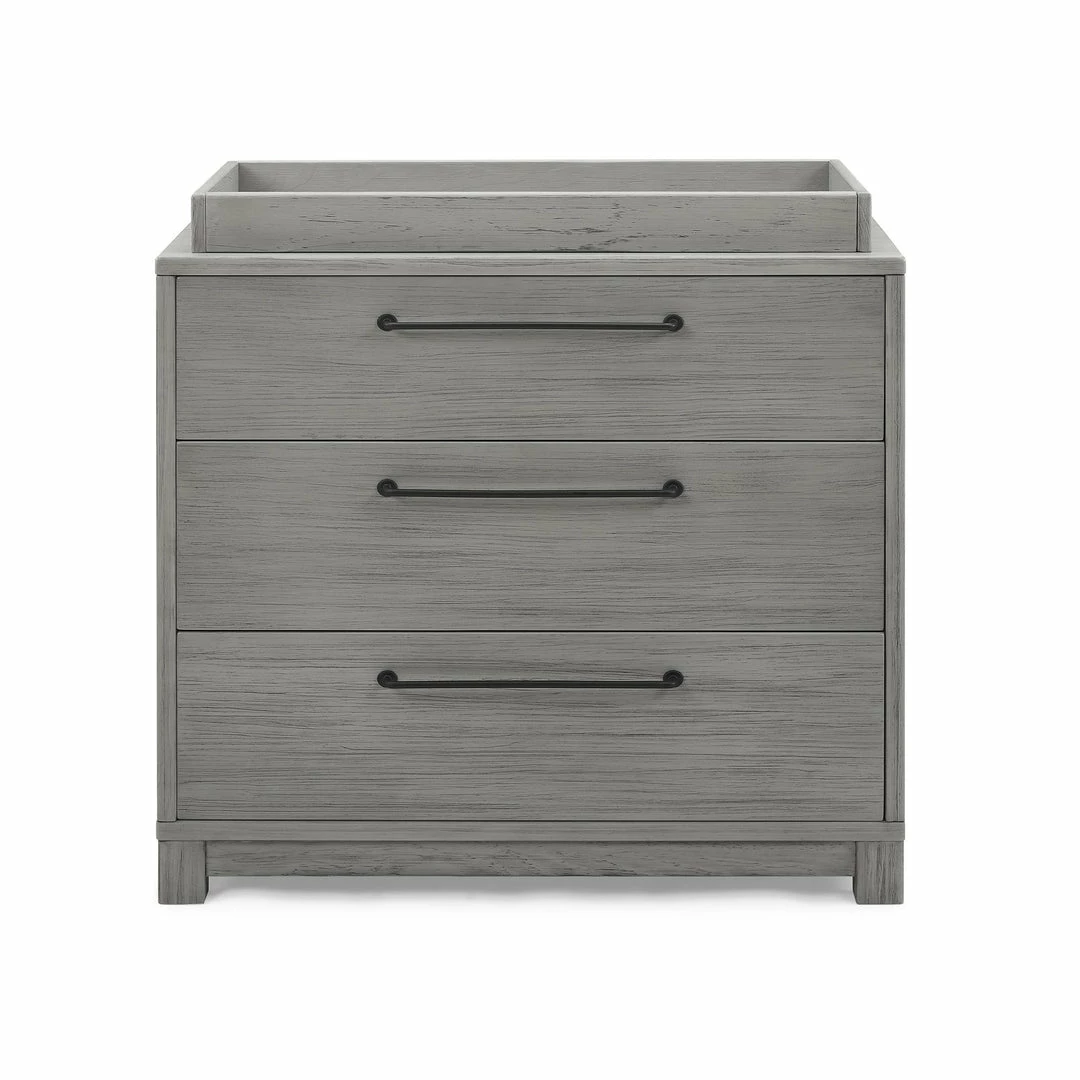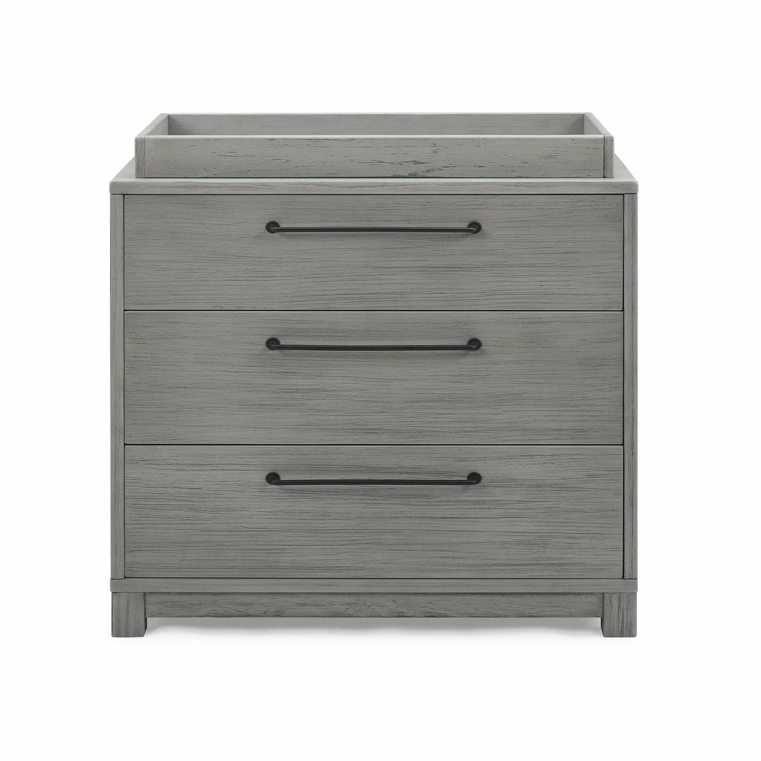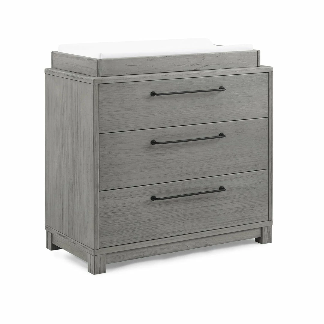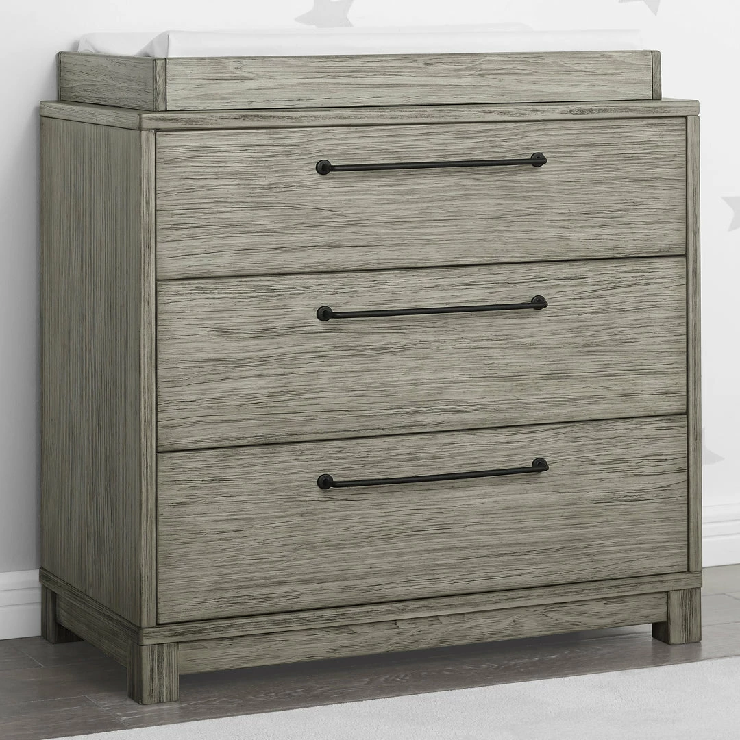 The Willow 3 Drawer Dresser with Changing Top by Simmons Kids adds modern farmhouse charm to any baby nursery or kids’ bedroom. Its softy textured finish that’s hand applied and industrial-inspired handles offer an updated take on rustic design. The Willow includes a removable changing top that creates the perfect space for diaper changing sessions now and is easily detachable, so you can create a more grown-up space later on. Pair this dresser with other pieces in the Simmons Kids Willow Collection for a coordinated look. Given the hand applied nature of this baby crib’s finish, variations in the wood are to be expected and celebrated